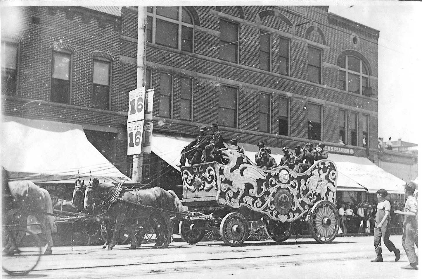 Donation, 04/26/2005. Black and white matte photographic print in landscape format. Image is of a large ornate horse-drawn circus wagon with two drivers and a band in the wagon. Two boys are in the street on right. On back: "S. Harrison St. 200 block 1906 or 1907."Collection