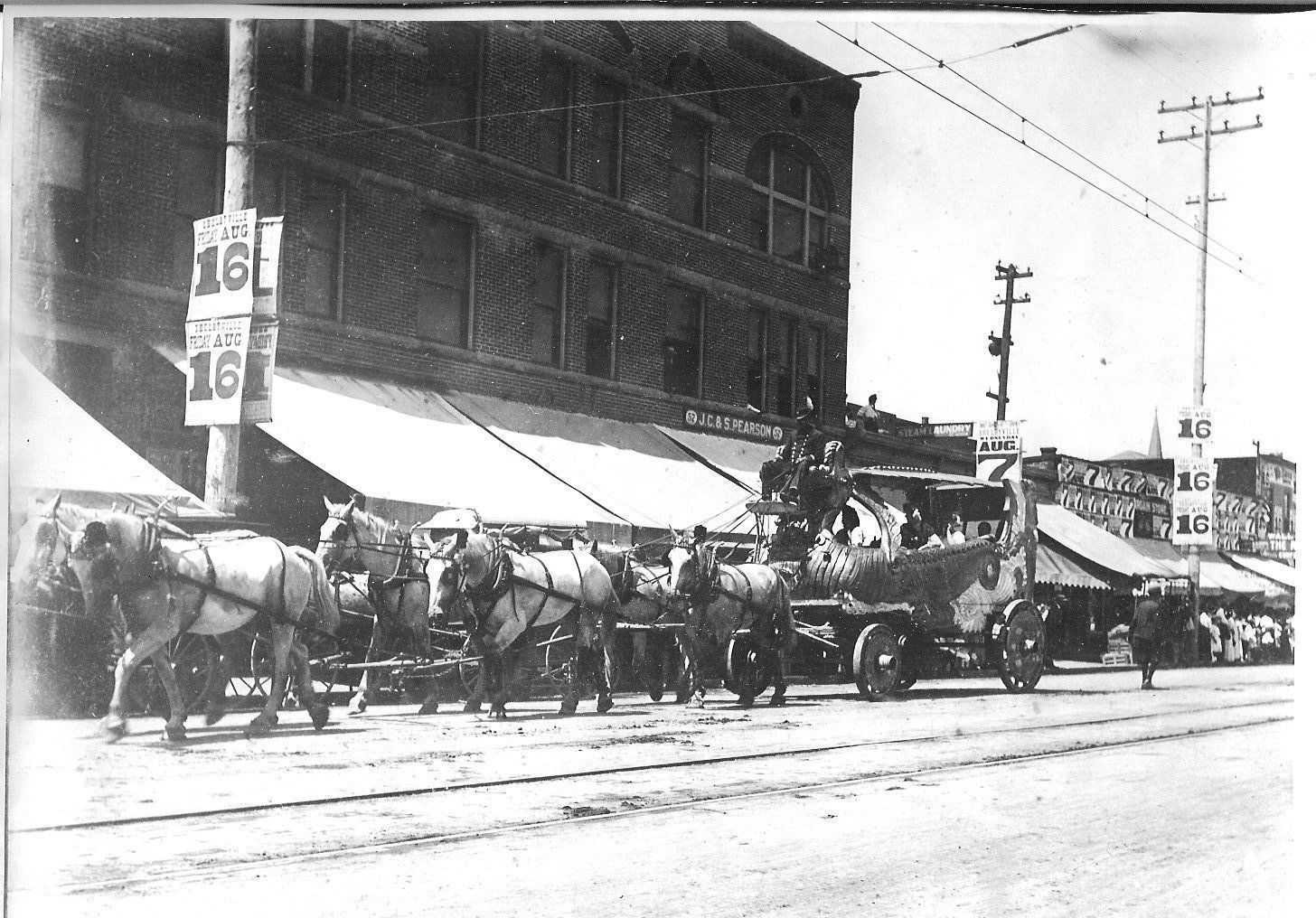 Donation, 07/26/2005. Black and white matte photographic print in landscape format. Image is of an ornate circus wagon with a six-horse hitch and one driver. Sign on electric pole reads: "Shelbyville/Friday Aug./16" Another sign says: "Shelbyville/Wednesday/Aug/7". Over a store awning is a sign: "J. C. & S. Pearson". On back: "Circus Parade S. Harrison St. 1906 or 1907".Collection