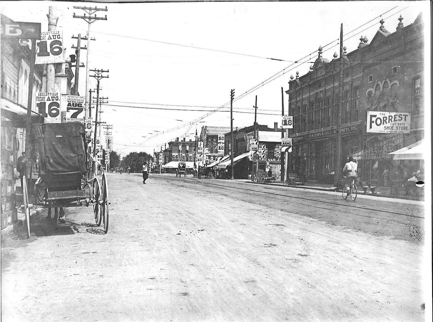 Donation, 07/26/2005. Black and white matte photographic print in landscape format. Image is of an empty street. On the left a buggy is parked at the curb. On the right is a man on a bicycle. Sign on store "The/Forrest/Cut-rate/Shoe Store/Sells Shoes for Less". Large signs are the same as in (B): "Aug 6, Aug. 7 and Aug. 16". On back in ink: "S. Harrison/looking North/from Broadway/1906 or 07".Collection