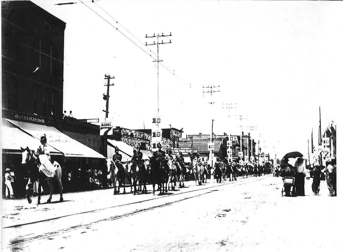 Donation, 07/26/2005. Black and white matte photographic print in landscape format. Image is over-exposed and poorly detailed. People on horseback led by a woman in white riding side-saddle. Large numbers on poles. On back: "Circus Parade S. Harrison St./Taken from Hendricks St./1906 or 07".Collection