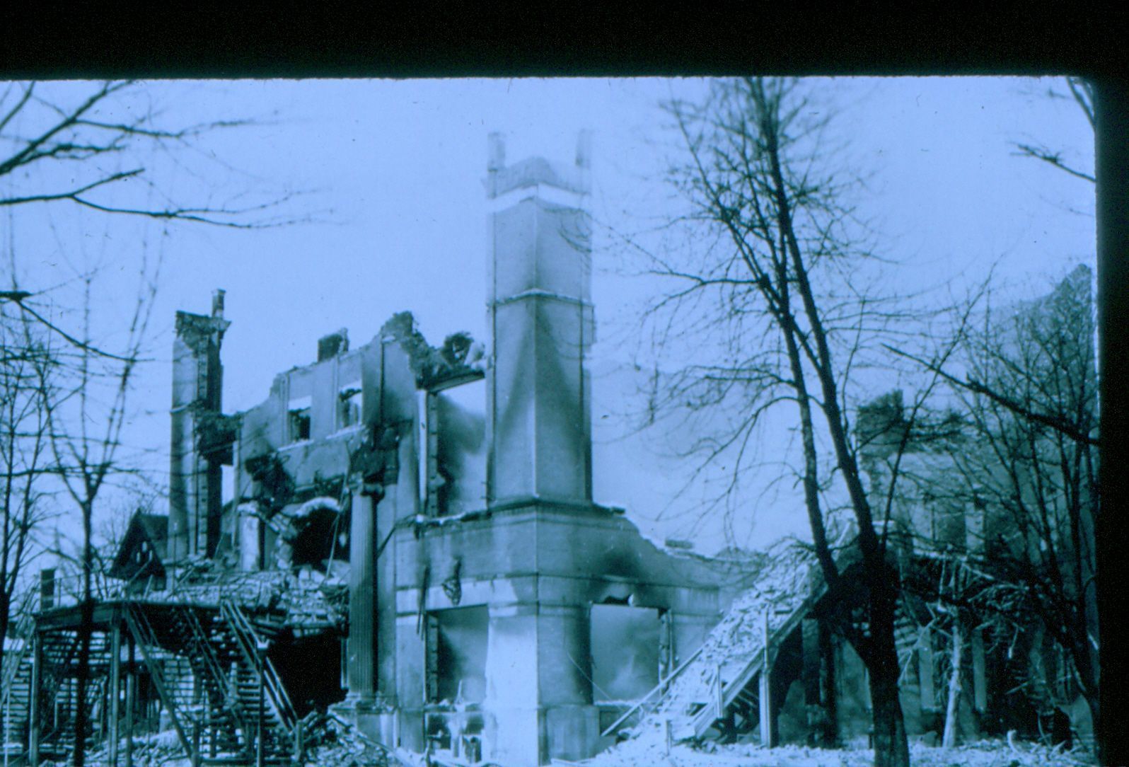 Donation, 07/26/2005. Black and white photographic slide in landscape format. Ruins of the City Hall fire.Collection