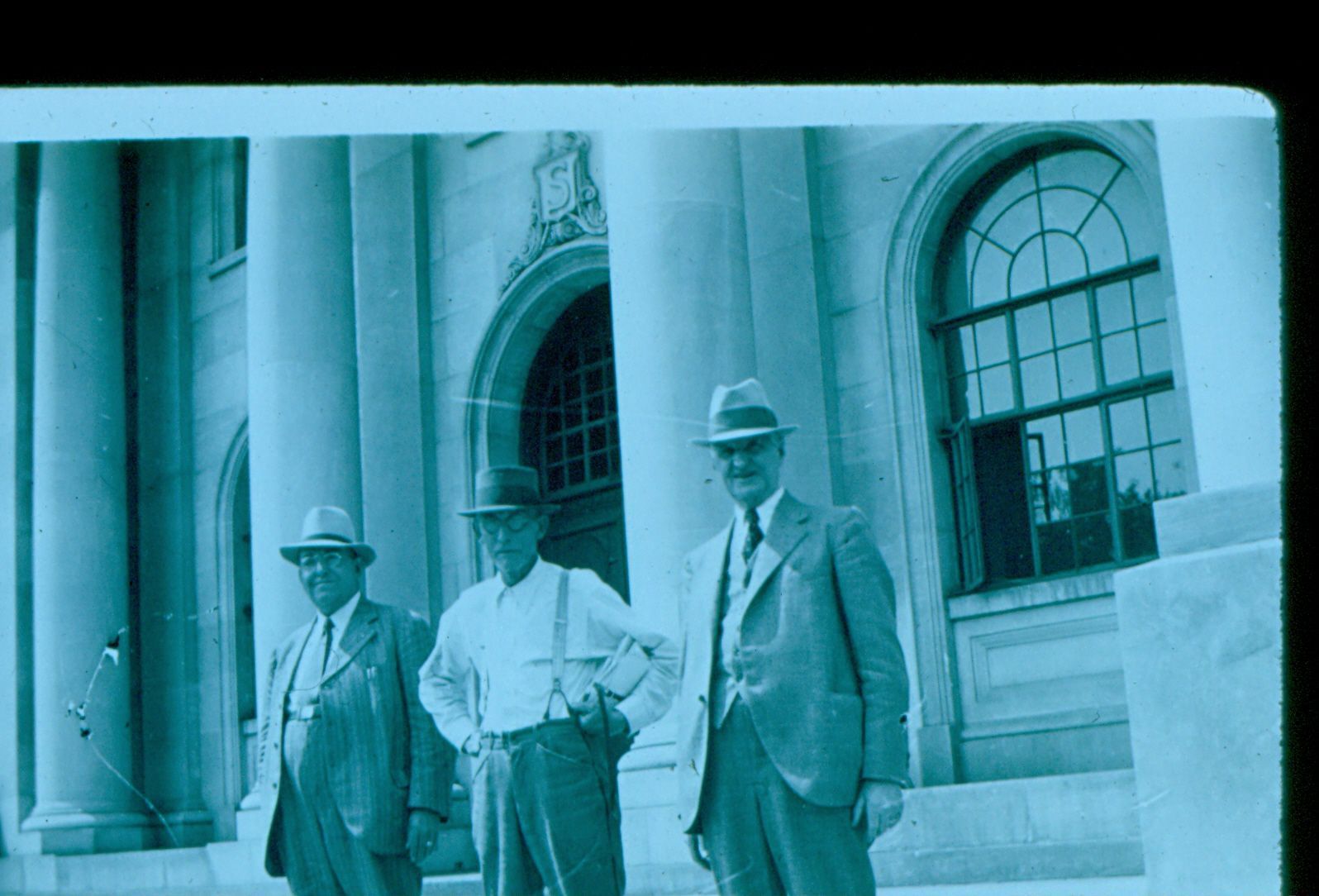 Donation, 07/26/2005. Black and white photographic slide in landscape format. This is a slide of a photo. Marked: "Police chief John Thompson/Mayor Lew Webb/& Julius Cheuden/City Hall/May 31, 1933"Collection