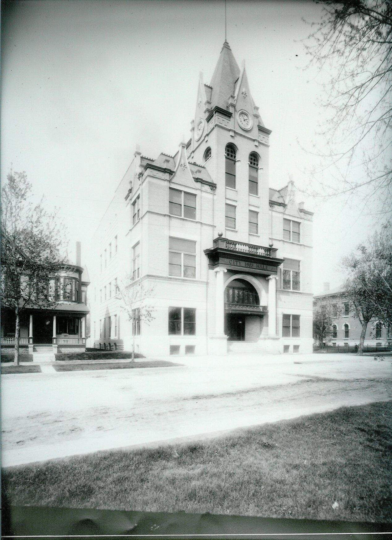 Black and white glass-plate negative (no #) in portrait format of the City Hall building, Shelbyville, IN. Two prints made of negative, 11/2003.Collection