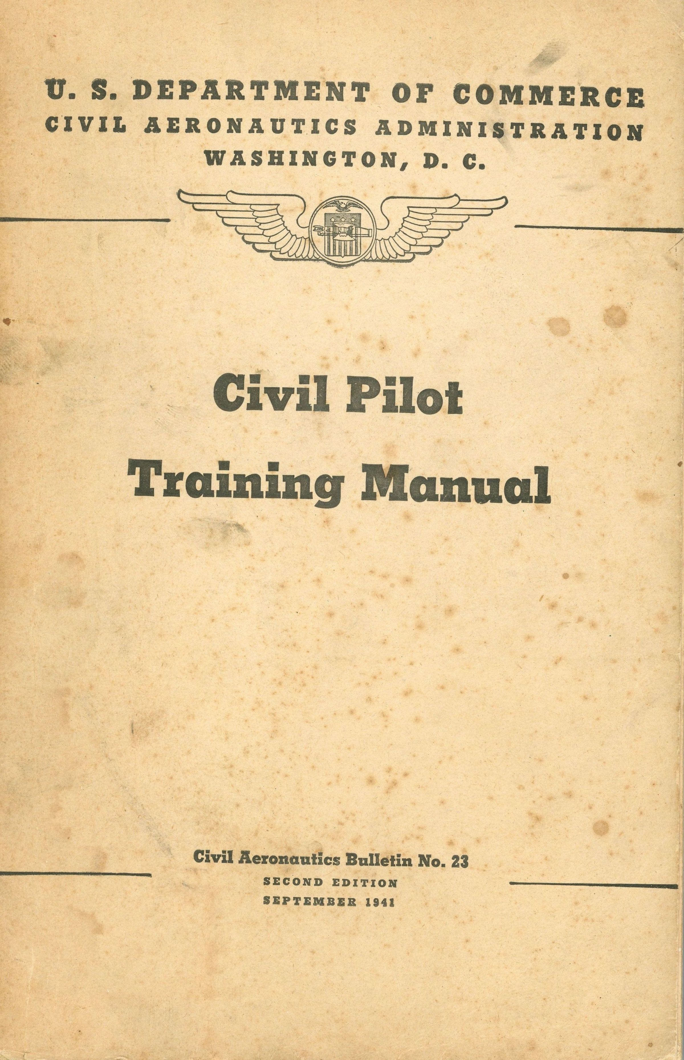 Paperback book with the Civil Aeronautics Administration War Training Service insignia above the title of "Civil Pilot Training Manual". At the bottom of the front cover, it reads "Civil Aeronautics Bulletin No. 23, Second Edition, September 1941". This information is repeated on the spine, and the back cover is blank.Context