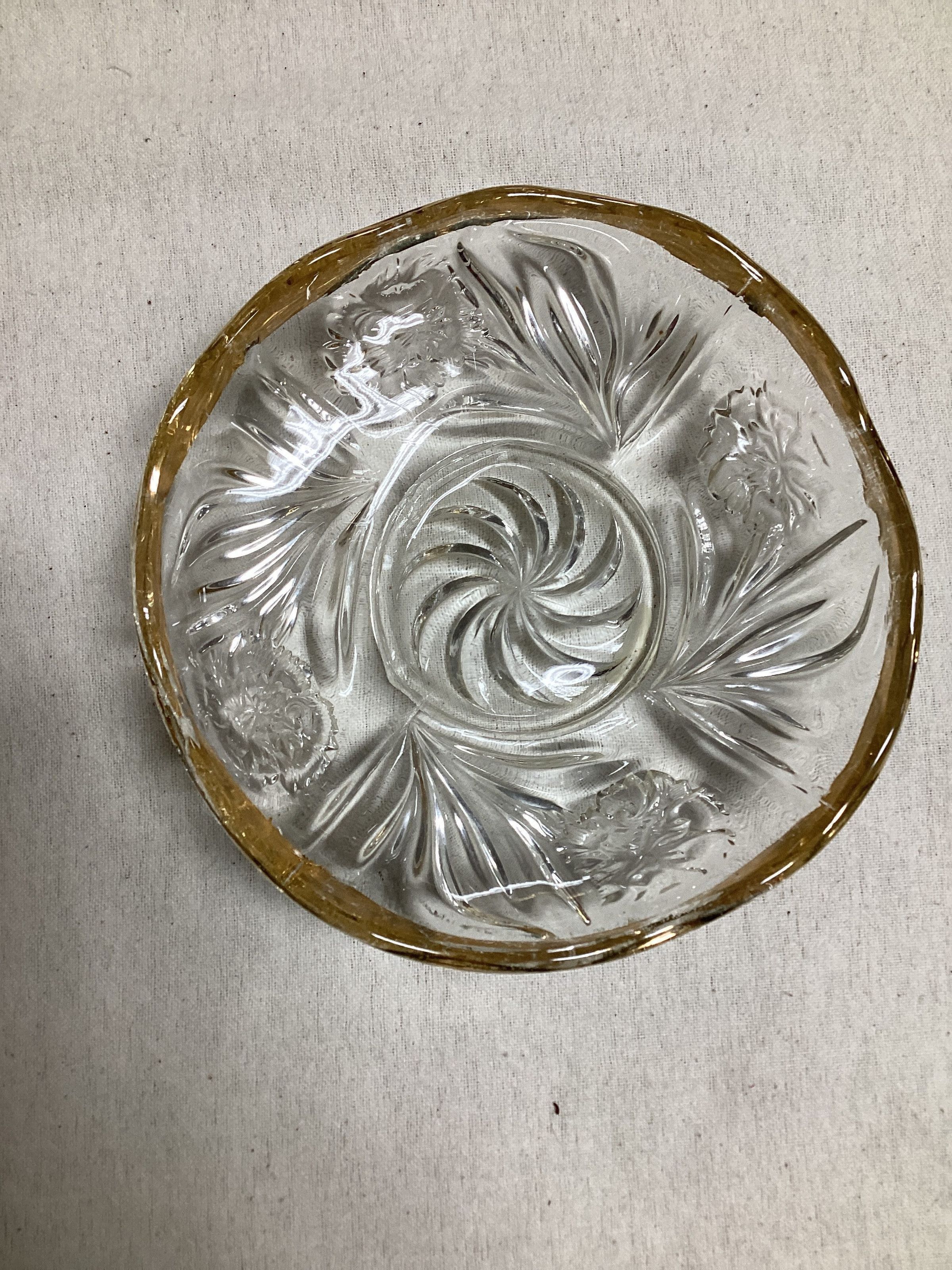 A: Round (6") candy dish with flowers & leaves molded in glass, whirligig-like design in bottom of dish. Gold band around top of dish.