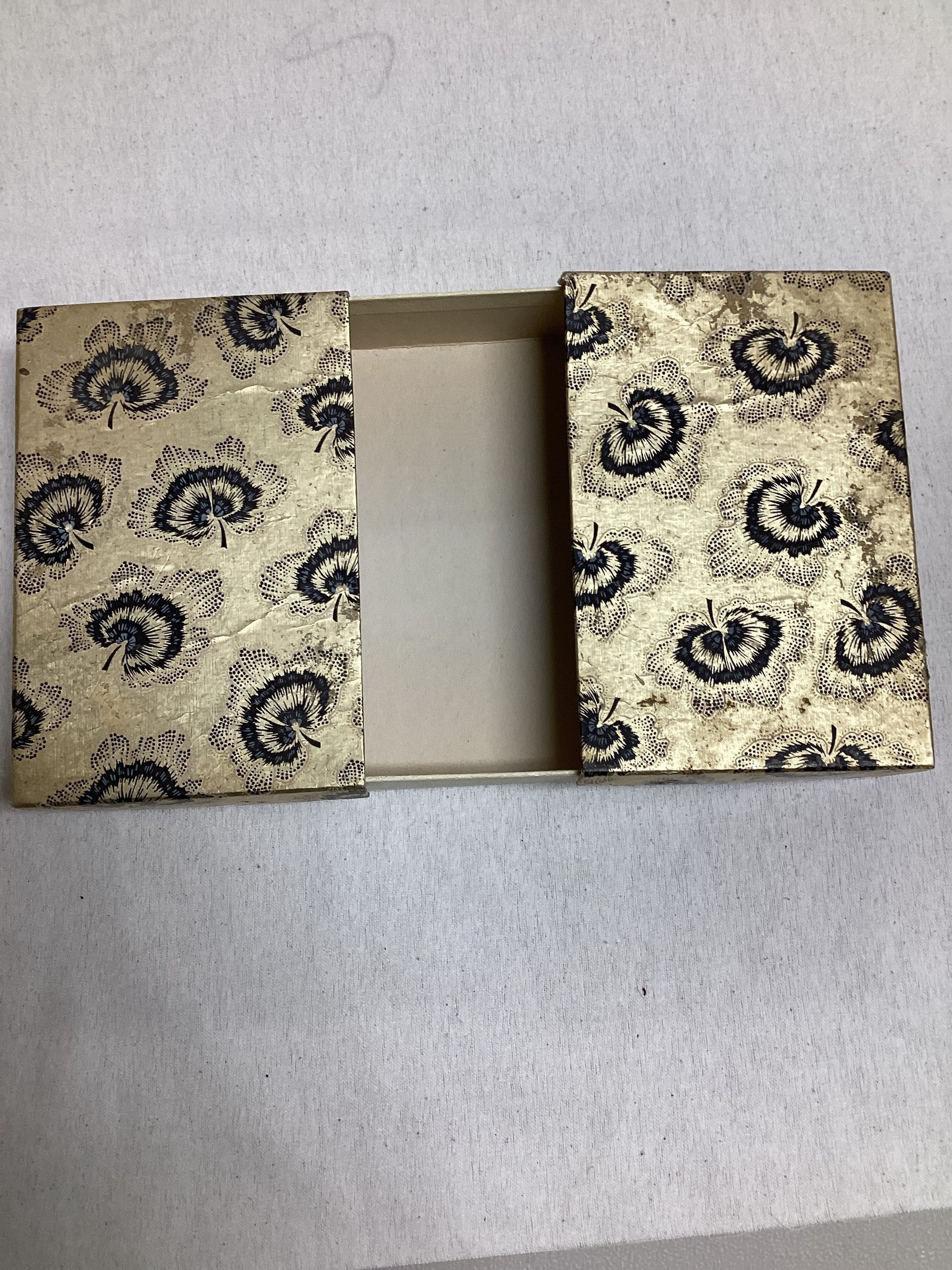 B: Box with gold-colored lid with black & blue leaf design all over. The lid divided in middle & opens up. The bottom of box is ivory. 8 1/2 x 6 1/4.Use