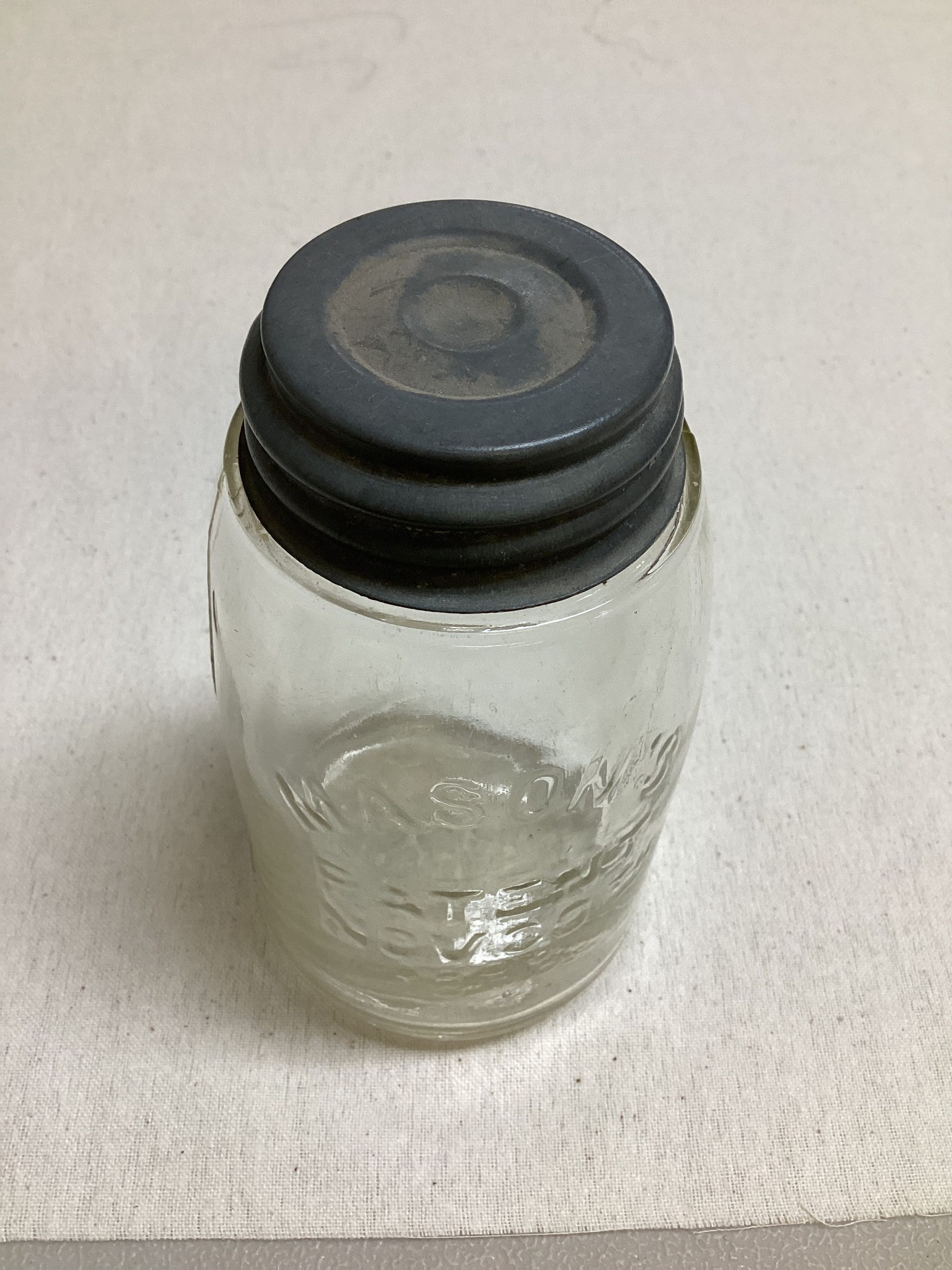 Clear glass jar, cylindrical ; slightly sloped shoulders; Lid in tin, porcelain lined with leter embossed and star. MASONS PATENT Nov. 30 1858 Star on bottom, Lid marked Porcelain lined for fruit jars.Use