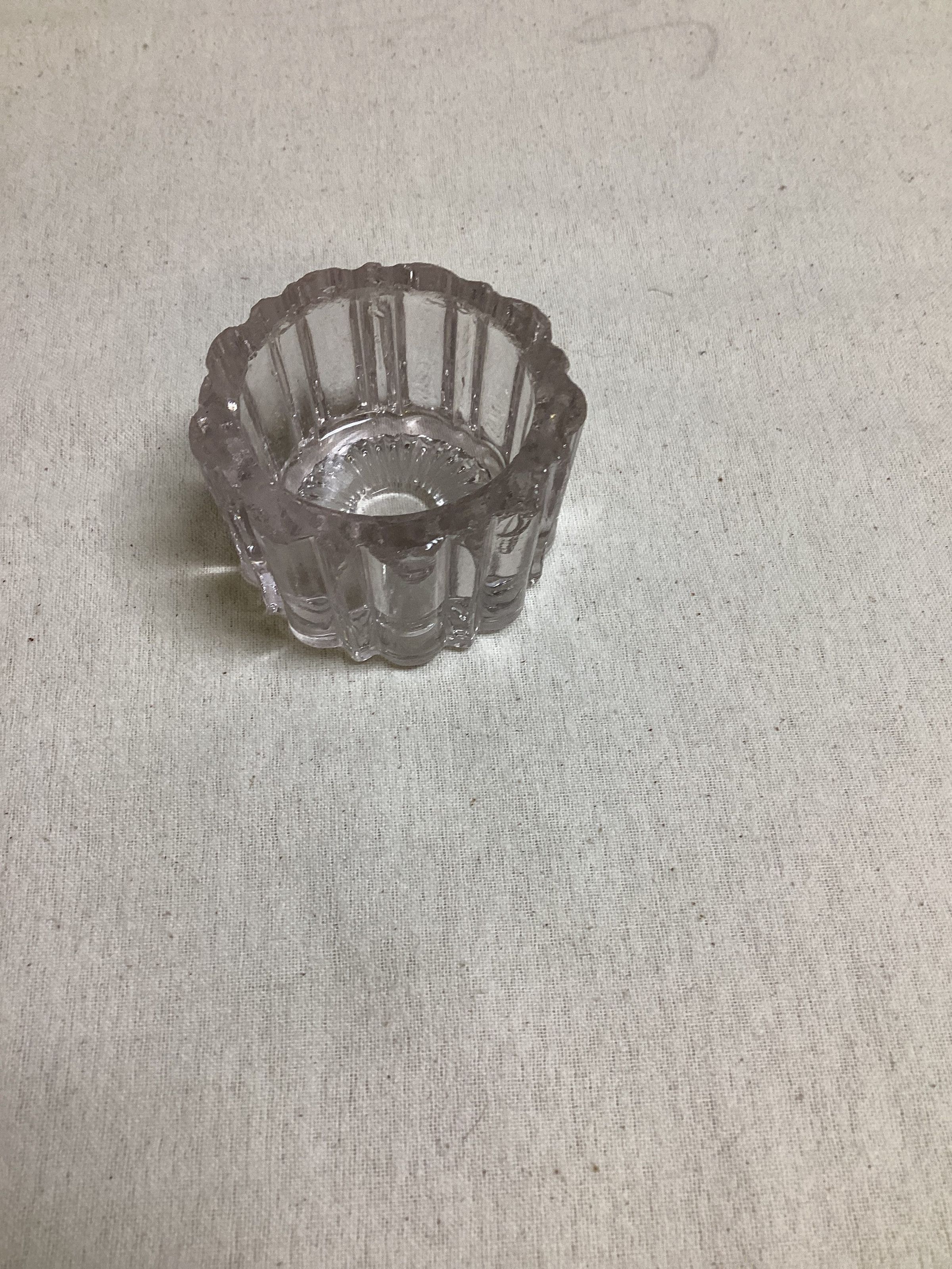 Pressed glass; clear with ribbed sides; indented bottom with spoke design; slight taper from bottom; round. According to donor this is a master salt which was kept on the table and individual salts were filled from it.Use