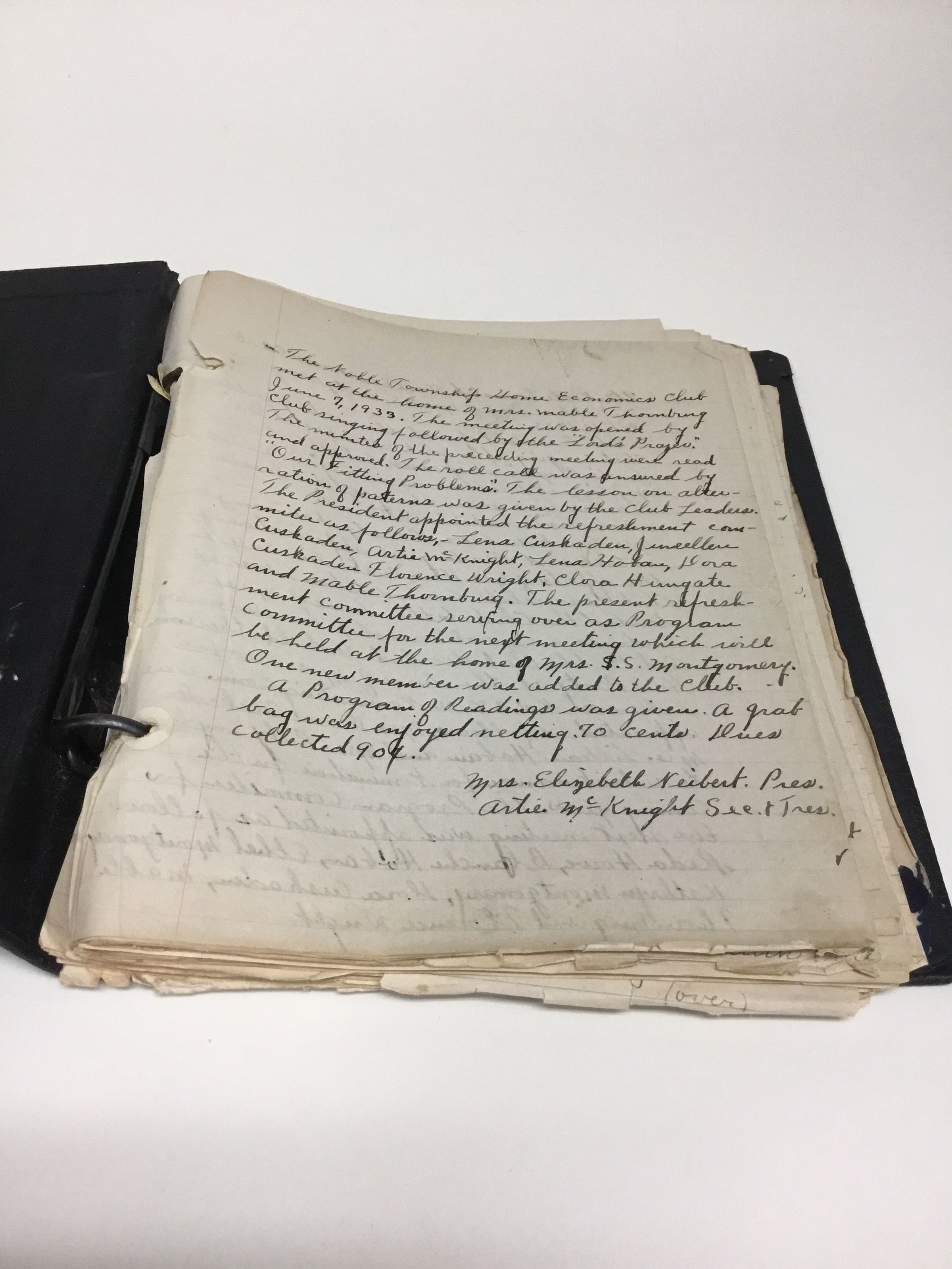 Loose leaf folder containing minutes of the Noble Township Home Economics Club, starting June 7, 1933 to December 11, 1945.Collection