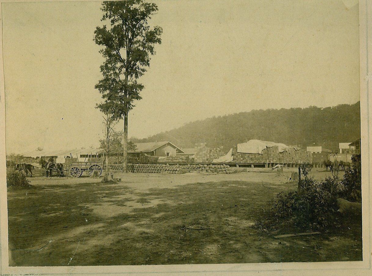 Sepia photographic print of a tall tree in center; wagon with uncovered ribs pulled by 4 mules is located near the tree, a man is astride the left rear mule; rows of stacked barrels in foreground; on a wooden platform behind the barrels are stacks of boxes covered by canvas; there is a one-story building behind the tree; low bushes visible in right corner; right edge near center are 4 more mules but cannot see what they are hitched to. One of 5 similar prints, one of which (86.1.11) is marked in pencil: "Photographed by Abraham Peaslee/son of William Jenkins Peaslee". Pencil inscription on back identifies this photo as the "Commissary Warehouse at Stevenson, Ala"Collection