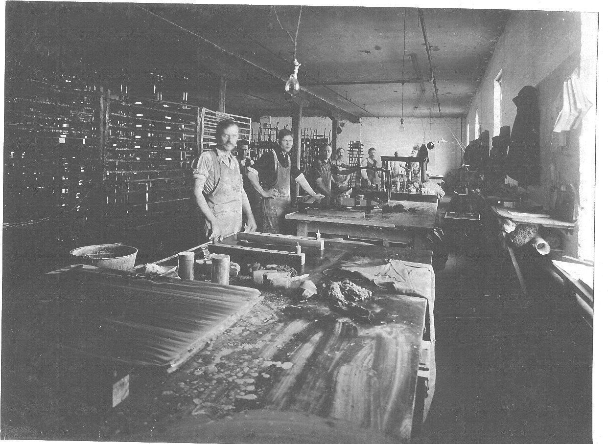 Black and white photographic print, landscape format, interior view. Work room of the Conrey-Birely Table Company, Shelbyville, IN. Eight men visible from front of room to back. Bare lightbulbs hanging from ceiling. Men are at work stations but posed to look at camera. (See also 97.24.1-18)Collection