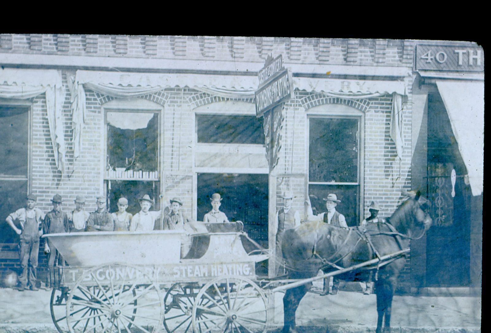 Donation, 07/26/2005. Black and white photographic slide in landscape format. "E. Wash/N. side/1902" Bath tub on a horse-drawn wagon. On wagon: