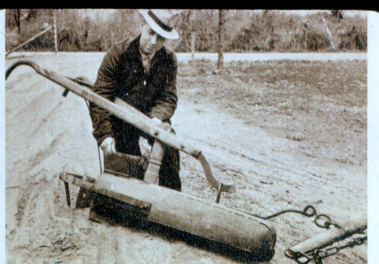 Black and white photographic slide in landscape format. Slide frame is marked: "Old Fashioned Corn Planter." This is a picture copied from a book.Collection