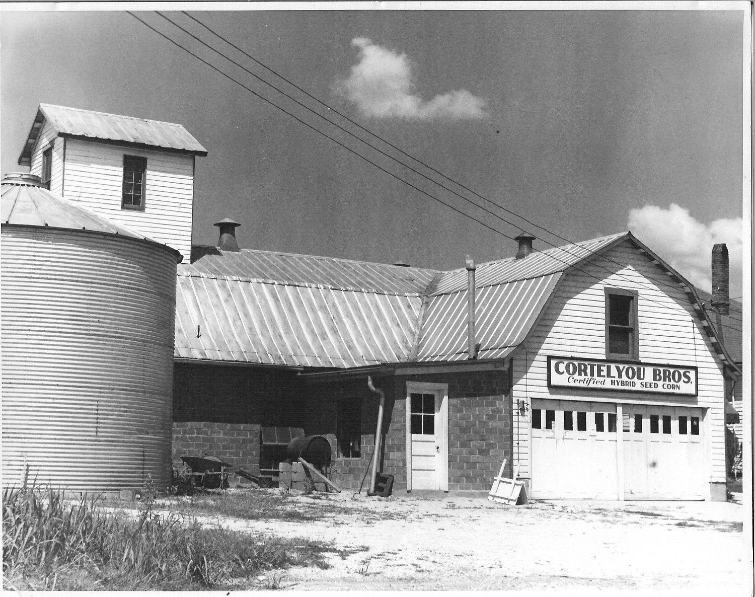 Black and white photographic print is an image of a large barn structure; has gambrel roof of tin; appears to be made of concrete block except for gable end that is showing and it is clapboard with 2 large garage-style doors; there is also a frame structure built on the roof crest to the left of the picture; left foreground is dominated by a metal grain storage bin; there is a wheelbarrow, an oil drum and scattered odds and ends next to the building; power lines run across the image; a sign over doors reads: "CORTELYOU BROS/Certified HYBRID SEED CORN". According to donor, this picture was taken in 1957 with a ca. 1912 Brownie Box camera by either J. T. Murphy or his wife. Donor further identified this building's location as being in Washington Township. Donation, 11/13/1983.Collection