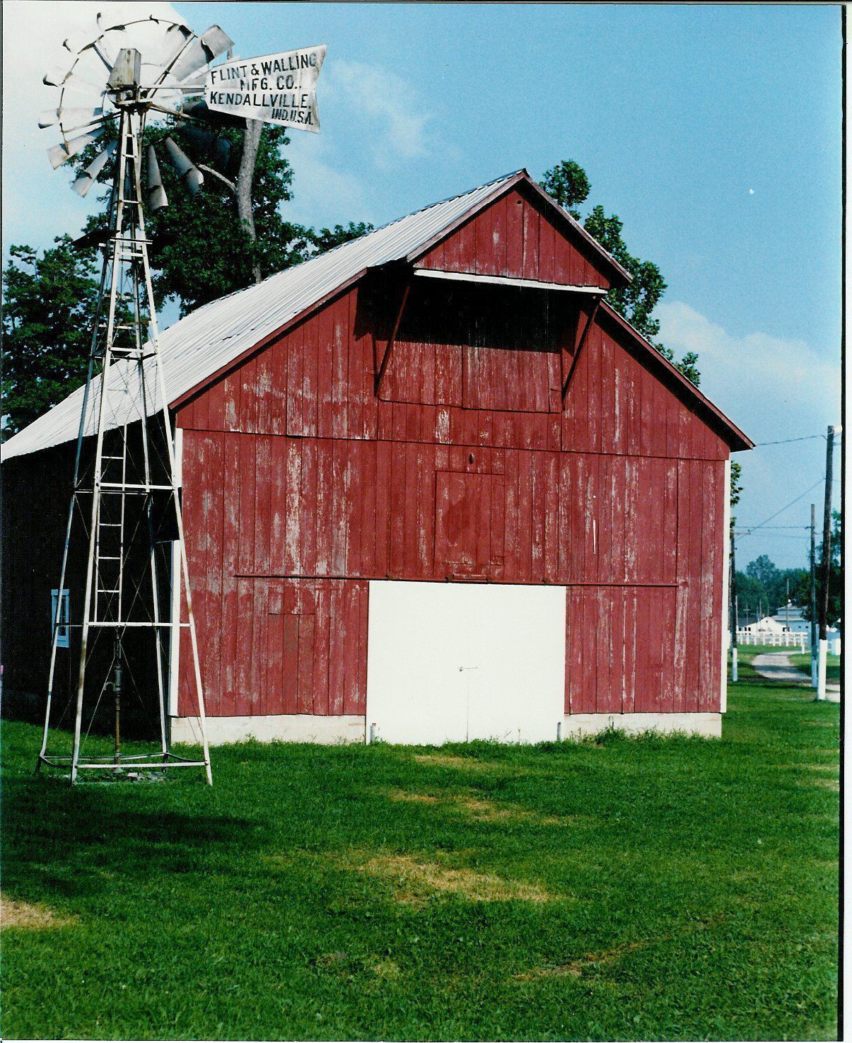 Full-color, glossy, photographic print in portrait format of red barn. On back of print in yellow wax pencil is: "Barn owned by/the Shelby County Historical/ Society located Shelby/County Fairgrounds/Photographed/summer 1987"