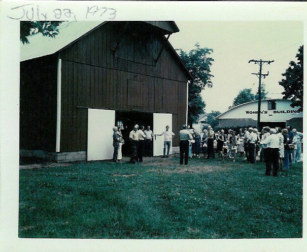 Full-color, glossy, polaroid snapshot photograph in landscape format. Image is of a crowd of people observing the Coulston Barn on its final site at the Shelby County Fairground. Barn was donated to the Shelby County Historical Society by Gael Coulston. Photo donated 12/14/2005.Collection