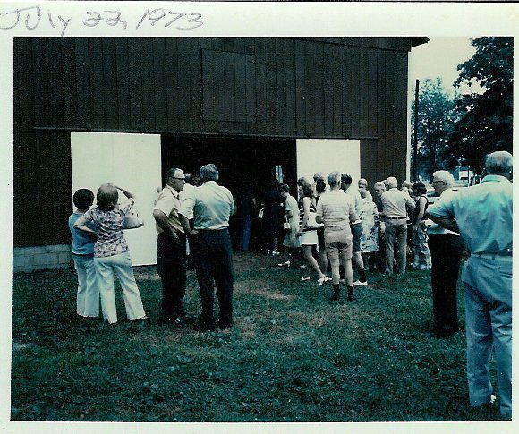 Full-color, glossy, polaroid photographic print in landscape format. Image is of the Coulston Barn on its final site at the Shelby County Fairgrounds. Many people observing. Written in the upper left corner of the image: "July 22, 1973."