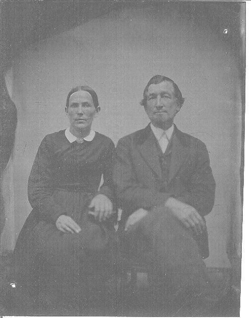 Tintype of a couple, both seated; man on right side to viewer, has high forehead, hair dark, parted on side & combed over, sticks out over ears,wearing 3 piece suit, collar of coat is darker than lapels, legs crossed at knees and holding crossed arms in lap; female has dark hair parted in middle & pulled back tight behind ears, dark clothing shows little detail although does have white collar w/little spot of gold color for pin at collar; some red in cheeks of both.