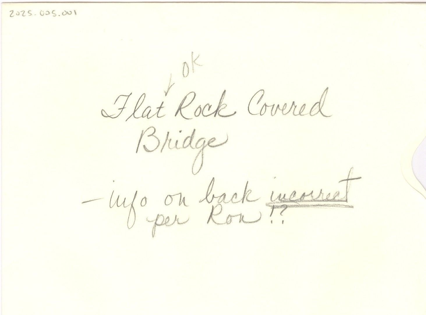 On white envelope picture is in: Flat Rock Covered Bridge with Ok written above