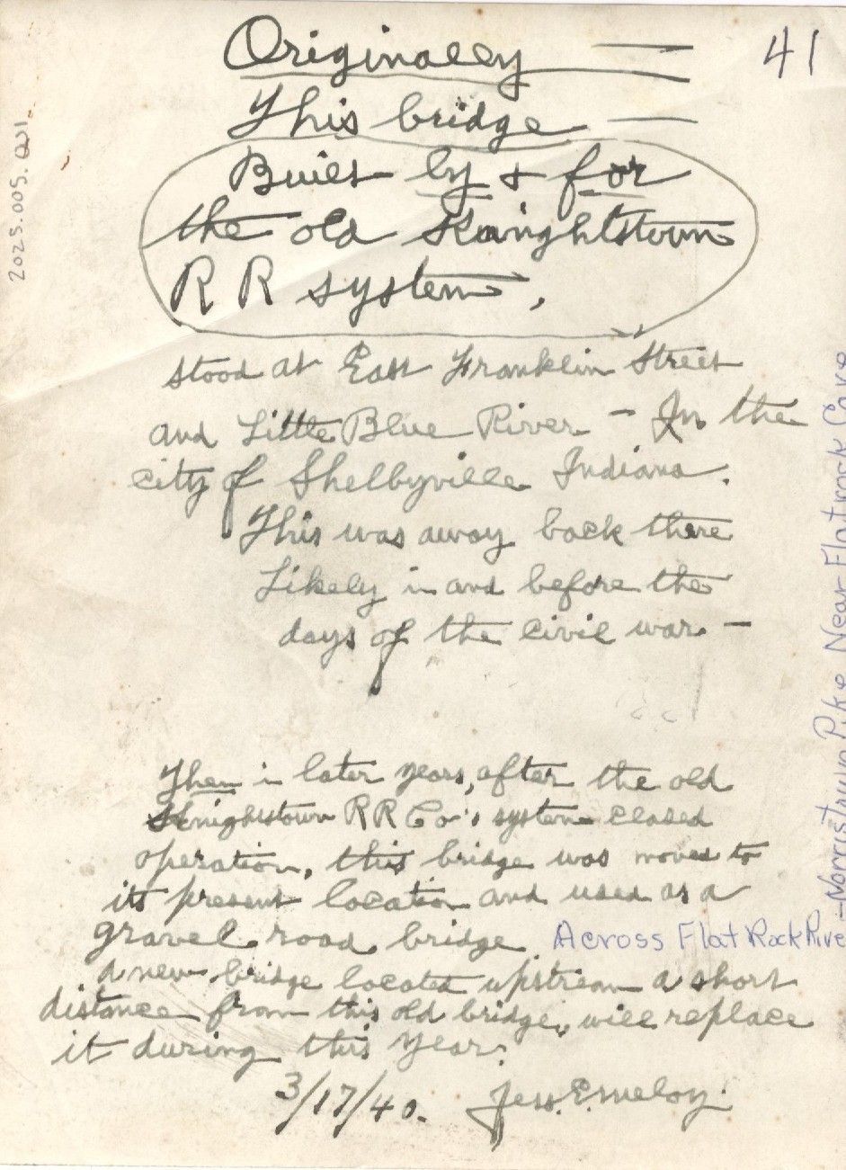 Then in later years, after the old Knightstown RR Co. system ceased operation. this bridge was moved to its present location and used as a gravel road bridge. "printed in blue ink Across Flat Rock River - Norristown Pike Near Flatrock Cave"