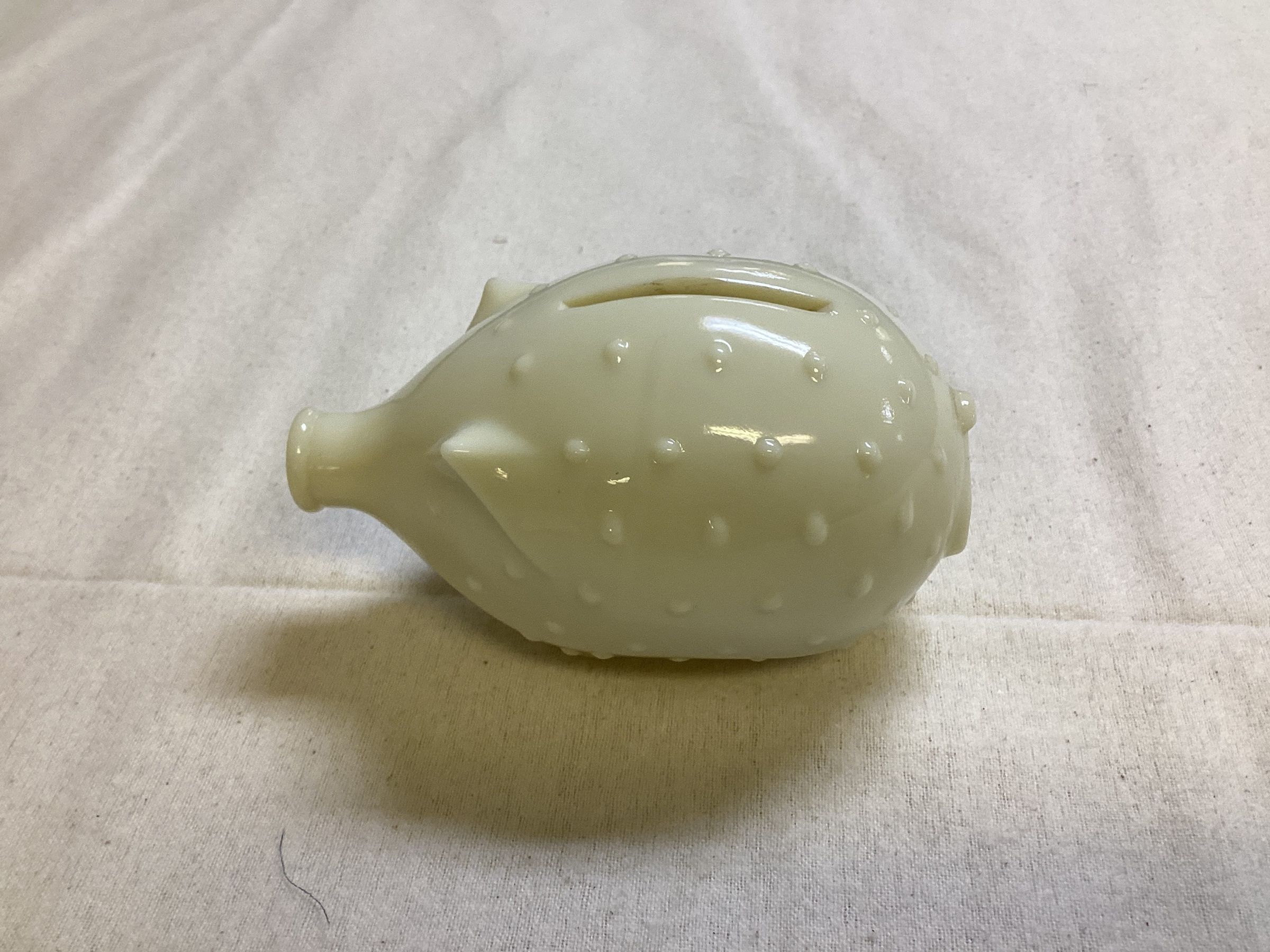 Cream colored glass piggy bank, apparently hand blown; with applied tail and stuffed all over with very small knobs. Pig shape in form, with bottle shaped nose; a small rim around the nose shape; molded ears on top side.