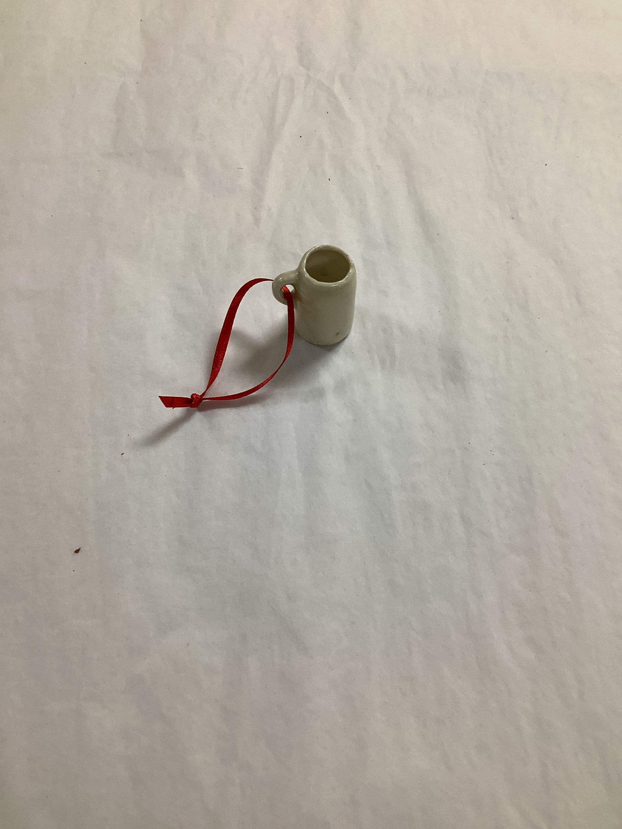 May be a creamer, mug, or milk pitcher, doll-size; white ceramic with shiney glaze; cylindrical shape that tapers slightly near the top; has a loop handle at top. Marks: incised near bottom edge is "4041".Collection