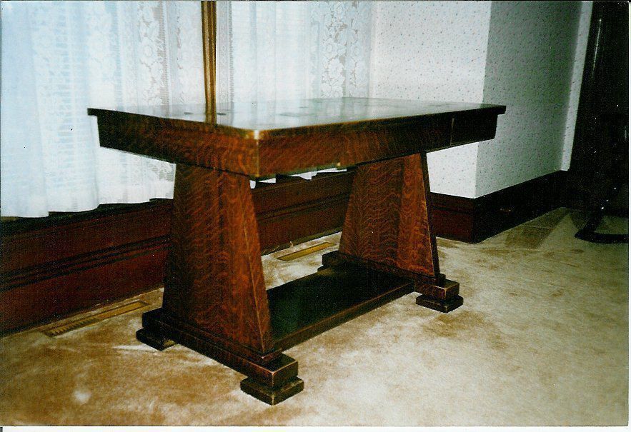 Full-color photographic snapshot in landscape format. Image is of a massive oak library table with triangular ends and square feet. Table sits in front of a large window with lace curtains, beige carpet on the floor. Table was manufactured by Danziger Furniture Company, Shelbyville, Indiana.Collection