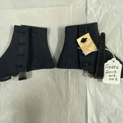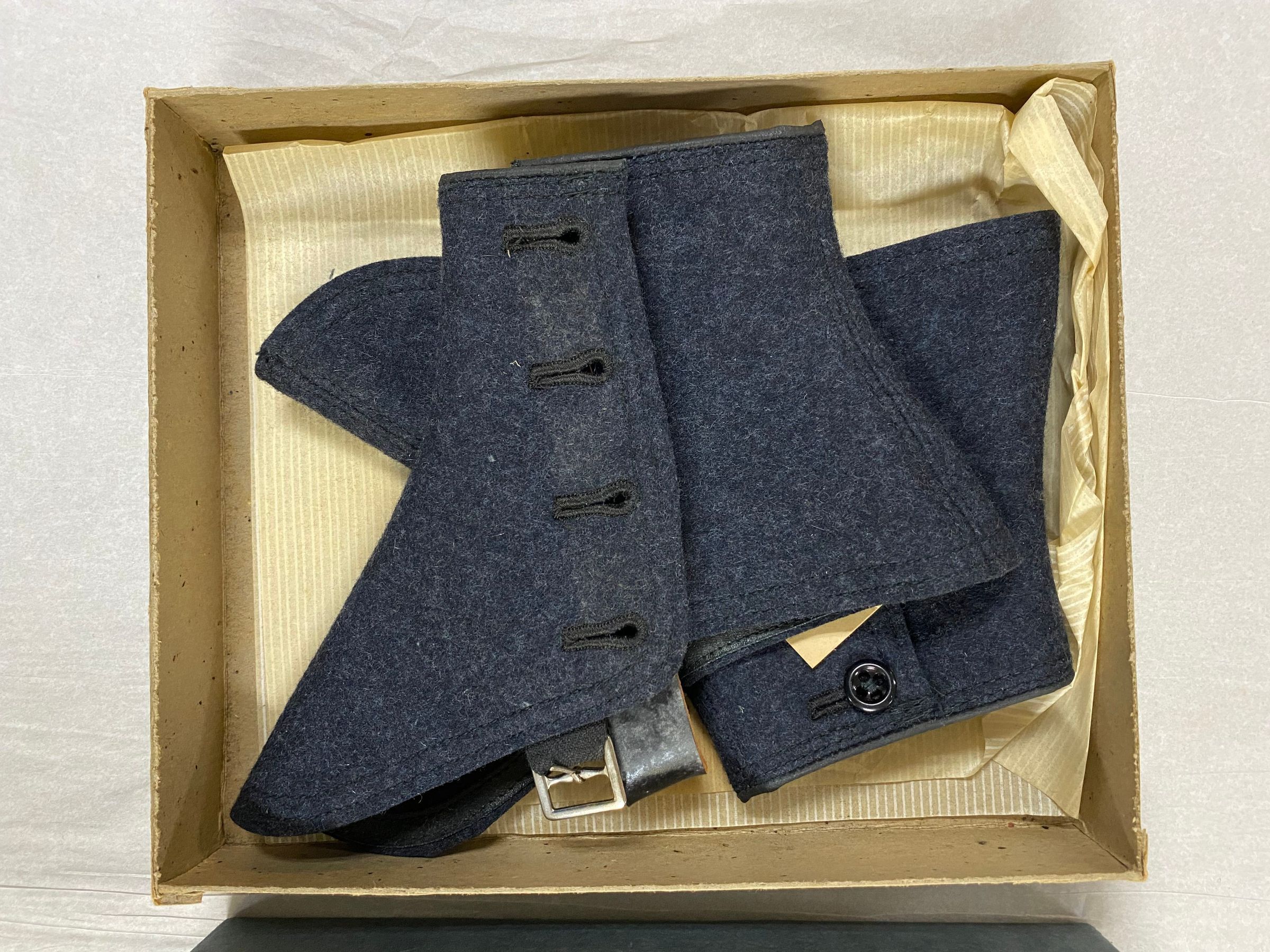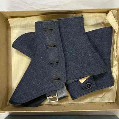 One boxed pair of spats, dark gray with 4 buttons & a strap and buckle, contained in a box with single sheet of tissue paper.