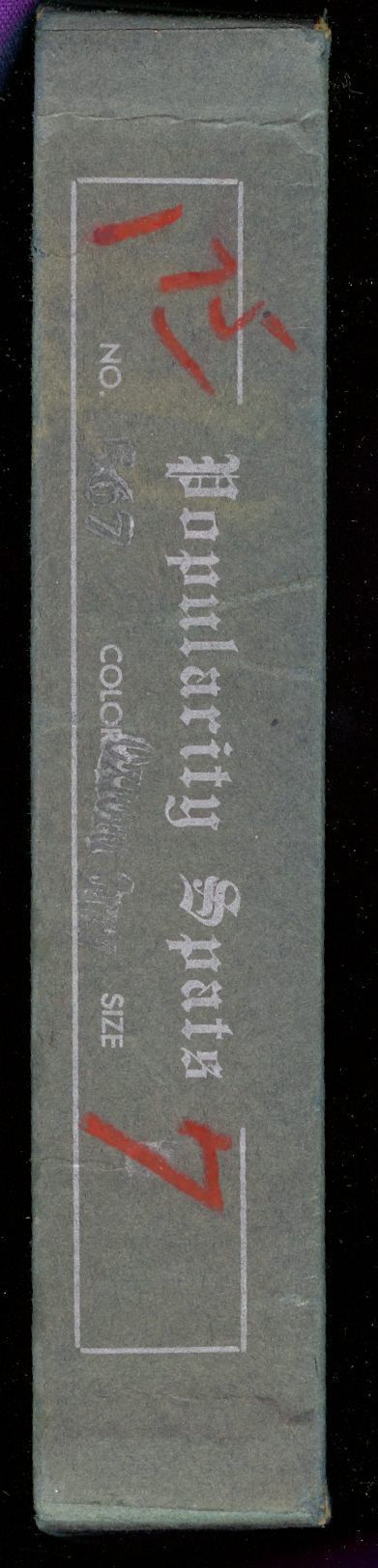 Lid of box reads: Popularity Spats. Front side of box lid has 1.75 in red; No. (illedgible); Color: (illedgible); SIZE: 7 (marked in red ink)
