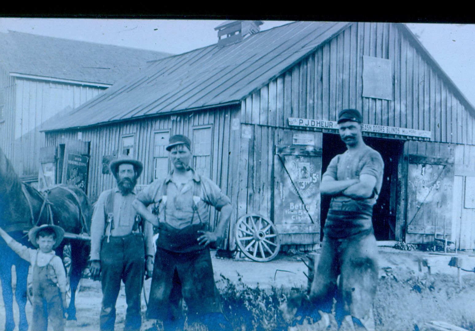 Black and white photographic slide in landscape format. Slide frame is marked: "DeHeur/ Blacksmiths" Image is of a small boy holding the reins of a horse. Three men are posing for the camera, two are wearing heavy aprons. The building in the background has a sign over the door: P. J. DHeur.Collection