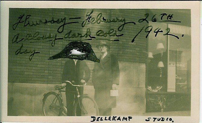 Donation, 07/26/2005. Black and white glossy photographic print in landscape format. In ink on front of photo: "Thursday-February 26th/a cloudy dark cold/day/1942./Dellekamp Studio." Image is of two men in front of a store. Man on left has had his head covered in black ink until the paper wore through.Collection
