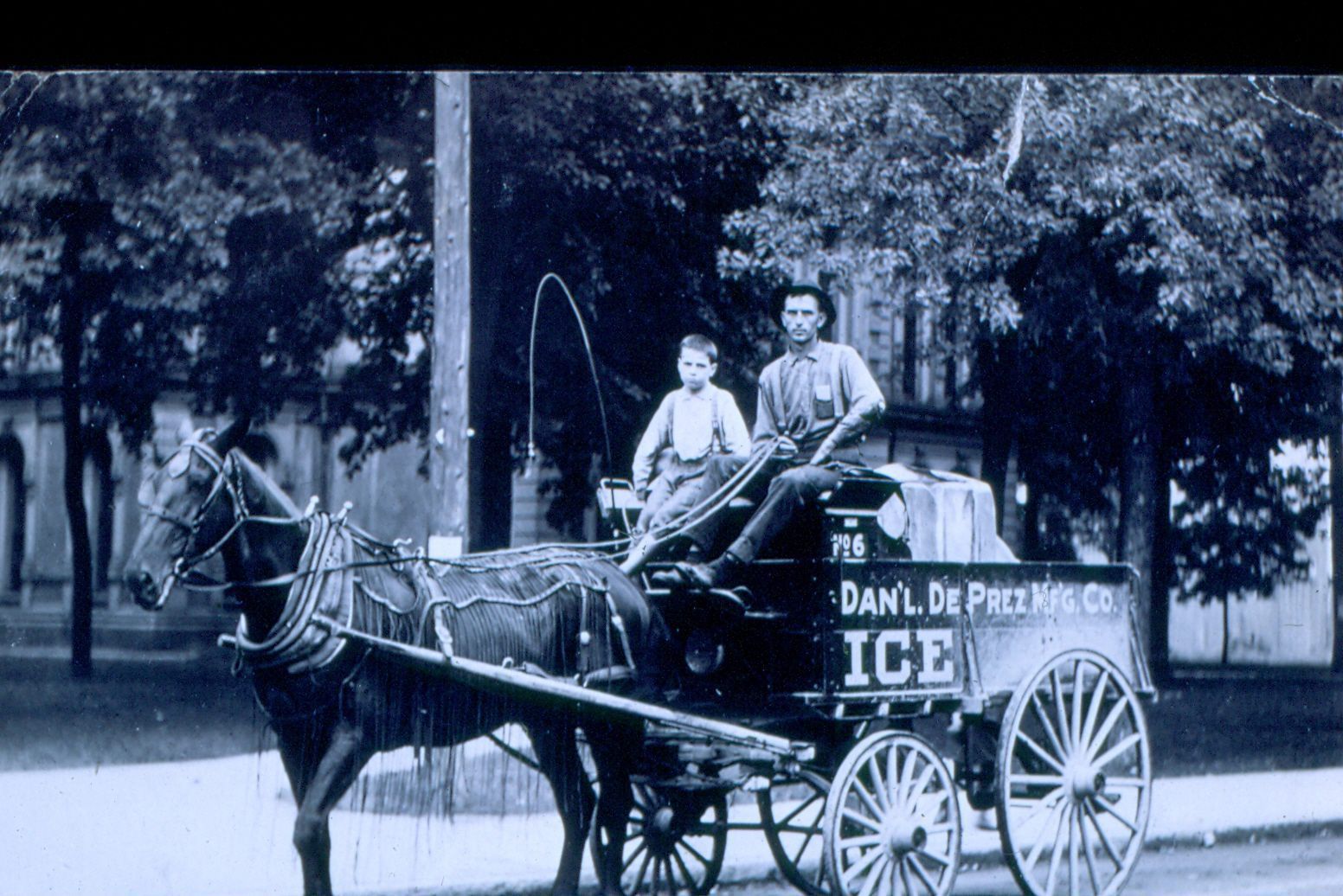 Donation, 07/26/2005. Black and white photographic slide in landscape format. Slide frame is marked: "Daniel DePrez Ice Wagon/S. Harrison St./1914." Image is of a one-horse hitch, man and boy on seat. On side of wagon: "Dan'l DePrez