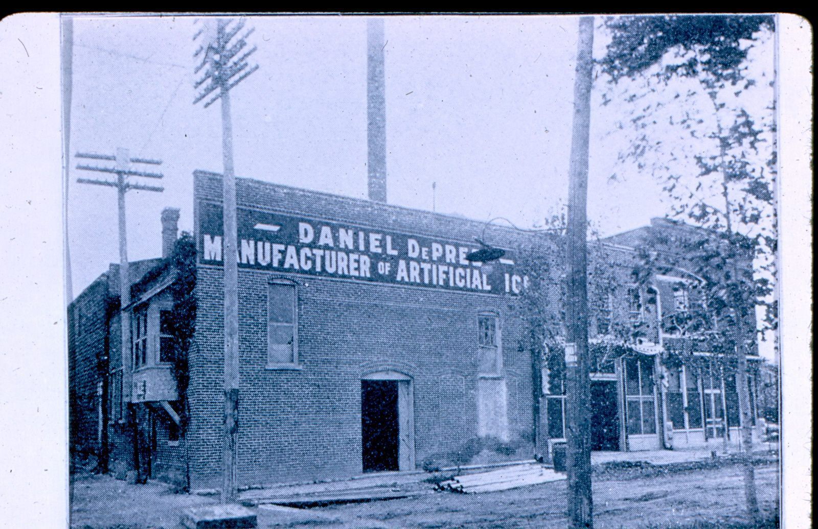 Black and white photographic slide in landscape format. Slide frame is marked: "Dan DePrez Ice Plant/E. Jackson." On building: "Daniel DePrez/Manufacturer of Artificial/Ice"Collection