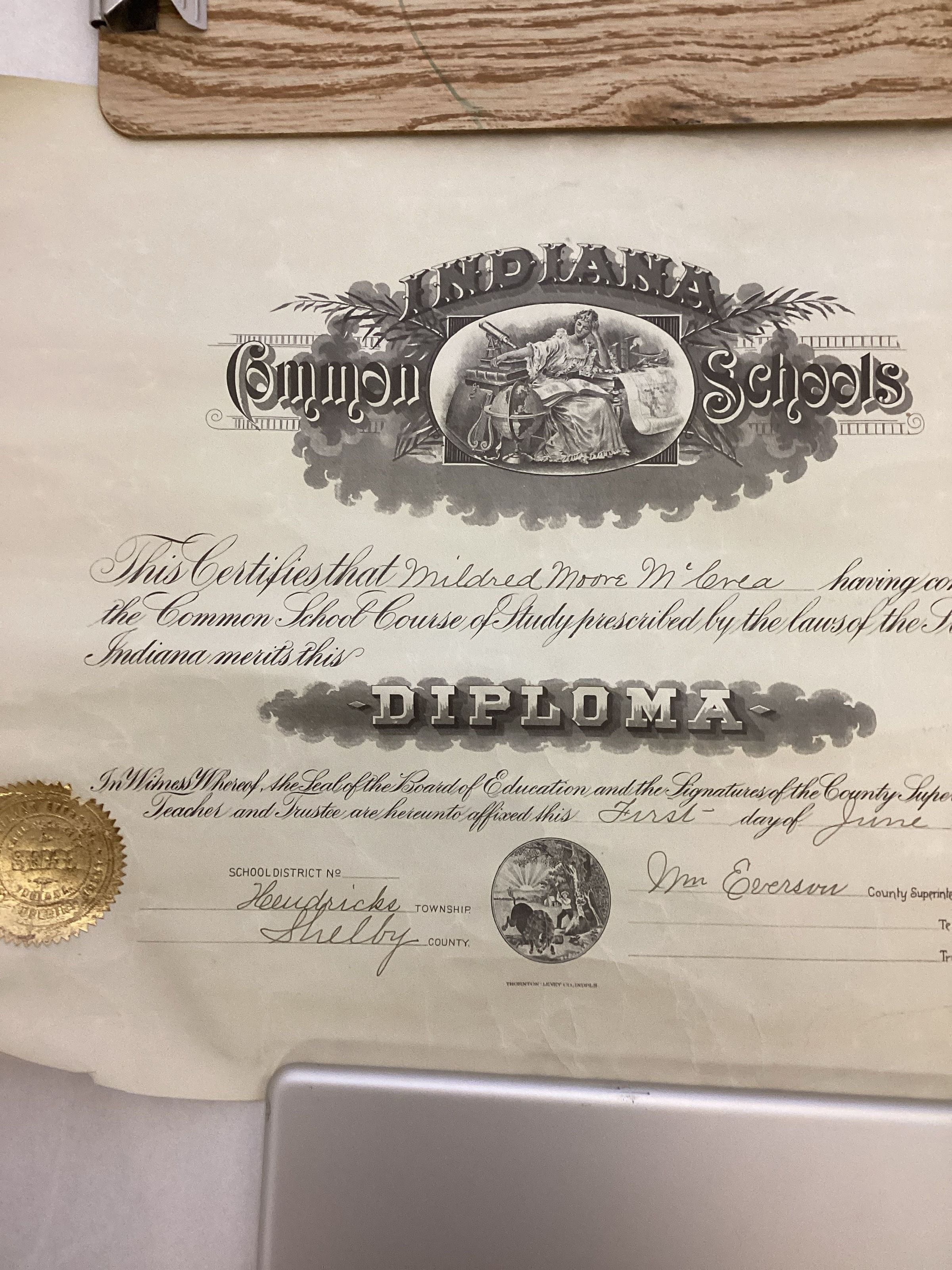 School diploma for Mildred Moore McCrea, dated June 1, 1929. Indiana Common schools, Hendricks township, Shelby CountyCollection