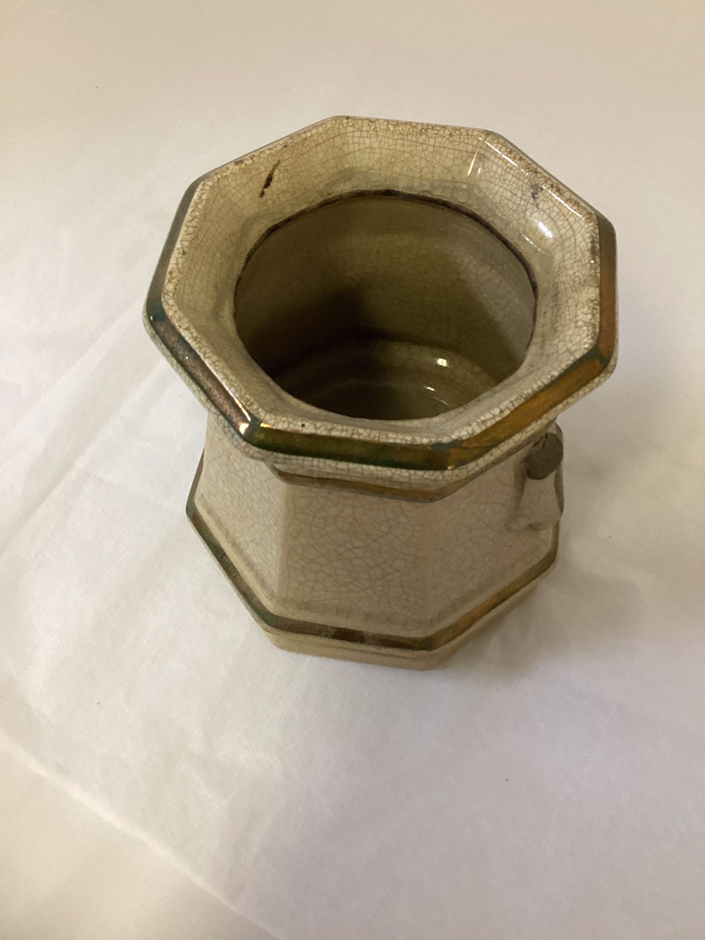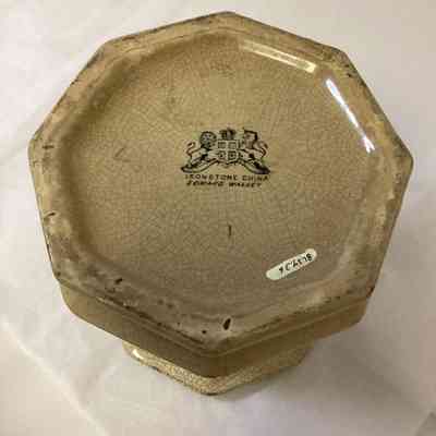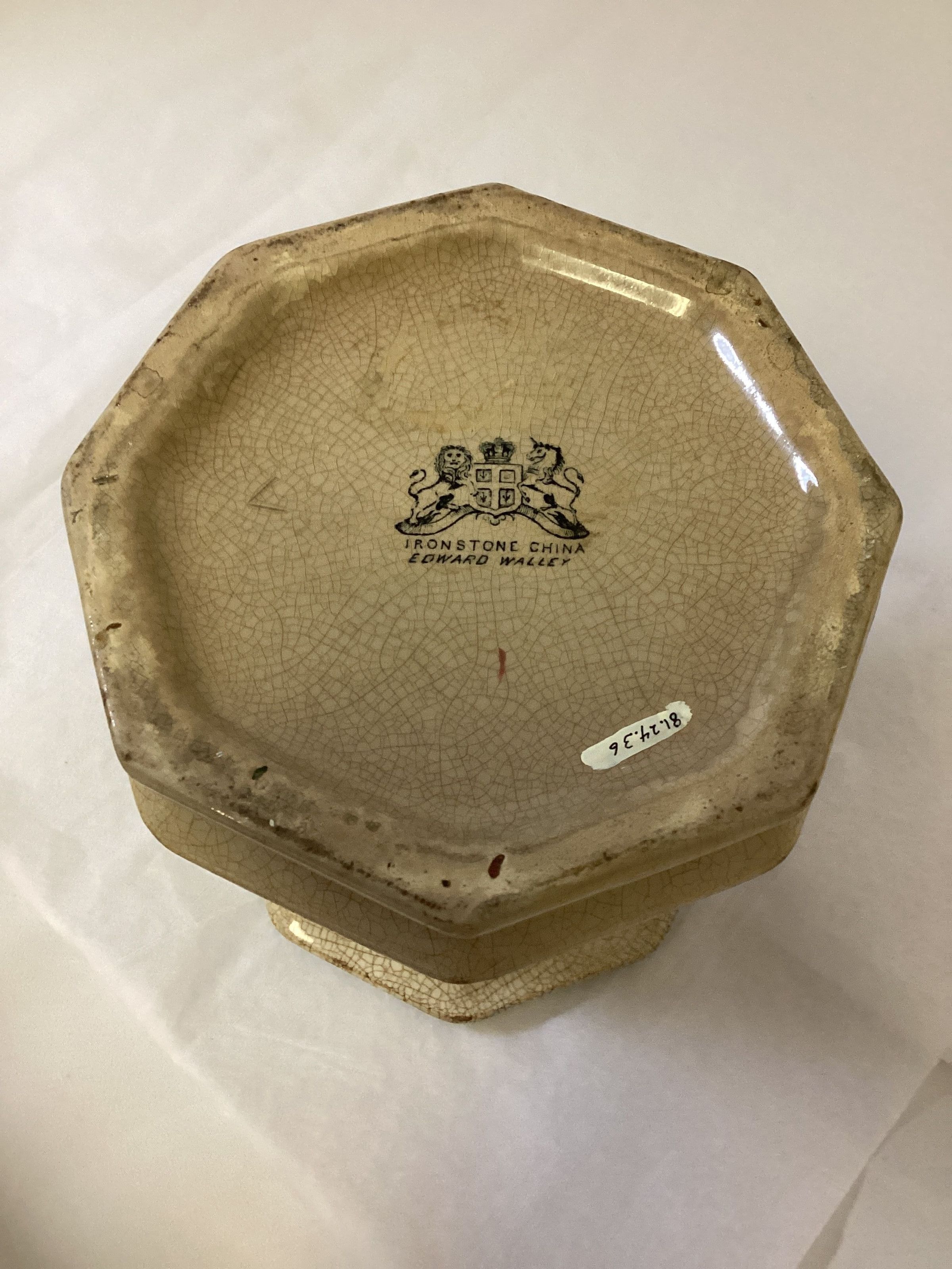 An octagon shaped sugar bowl; has a refective glaze; color is a sort of beige and there are slightly darker brown lines sll over surface under the glaze giving bowl a "crackled" look; from base it curves in slightly and then flairs out over base then panels taper in towards the top where it flairs lut again in three stages; there is a gold band on tip rim, one avbout an inch below it and one more about 1 1/4" from bottom; also a vertical gold band on each handle. Bottom is marked with a shield bearing a coat of arms topped by a crown, there is a banner running underneath and behind shield and a lion is on the right and a unicorn on the left of shield and underneath it reads "IRONSOTNE CHINA, EDWARD WALLEY'