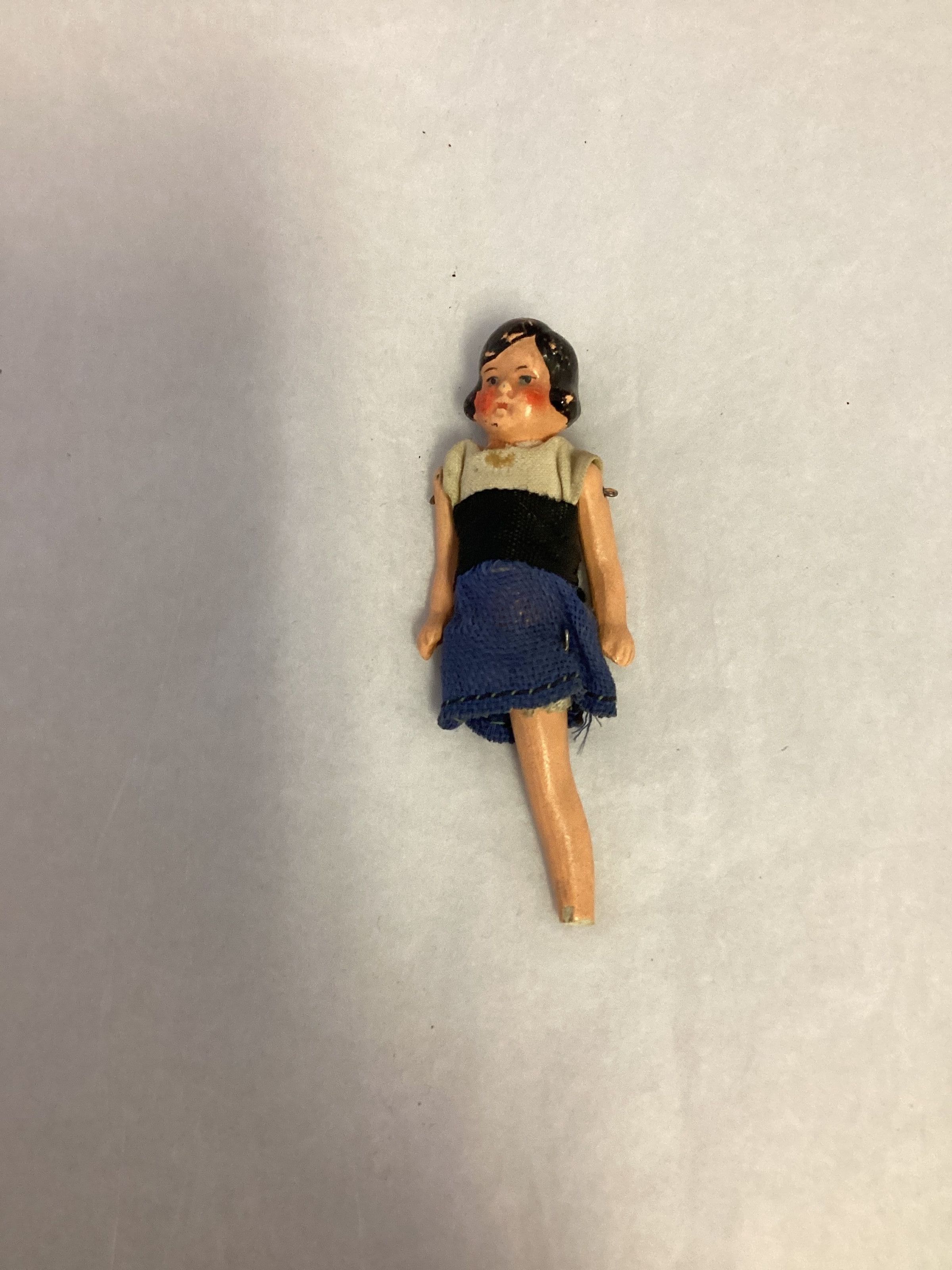 China doll, with moveable arms and legs that are attached with wire; hair, face and shoes are painted on; hair is black in a page boy style; black eyebrows blue eyes and rosy cheeks; shoes are black with a strap; wearing white blouse, blue skirt, and black cumberbund.