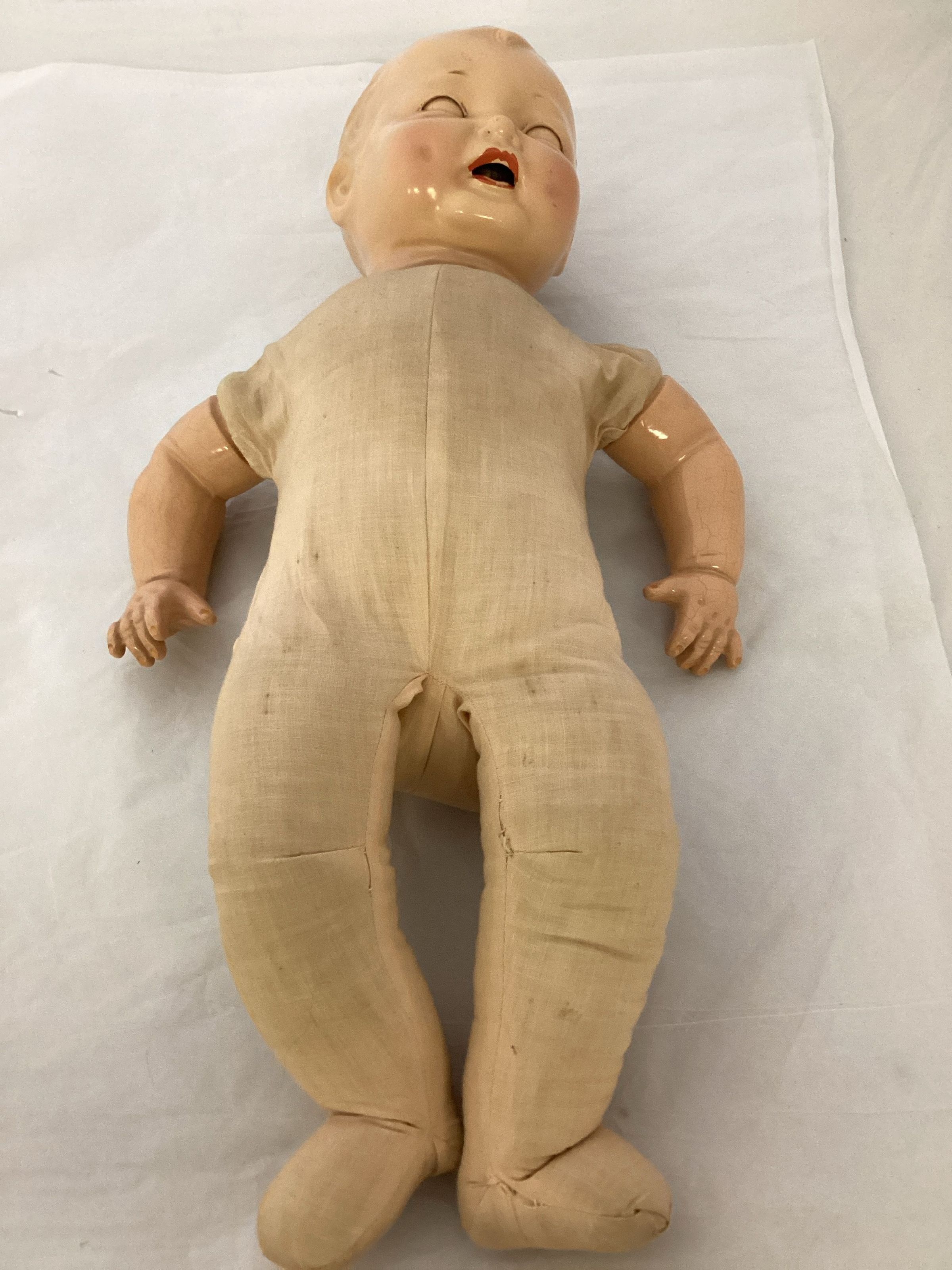 Doll with plastic type material, flesh color head and arms. Body is cloth in pale pink beige.Collection