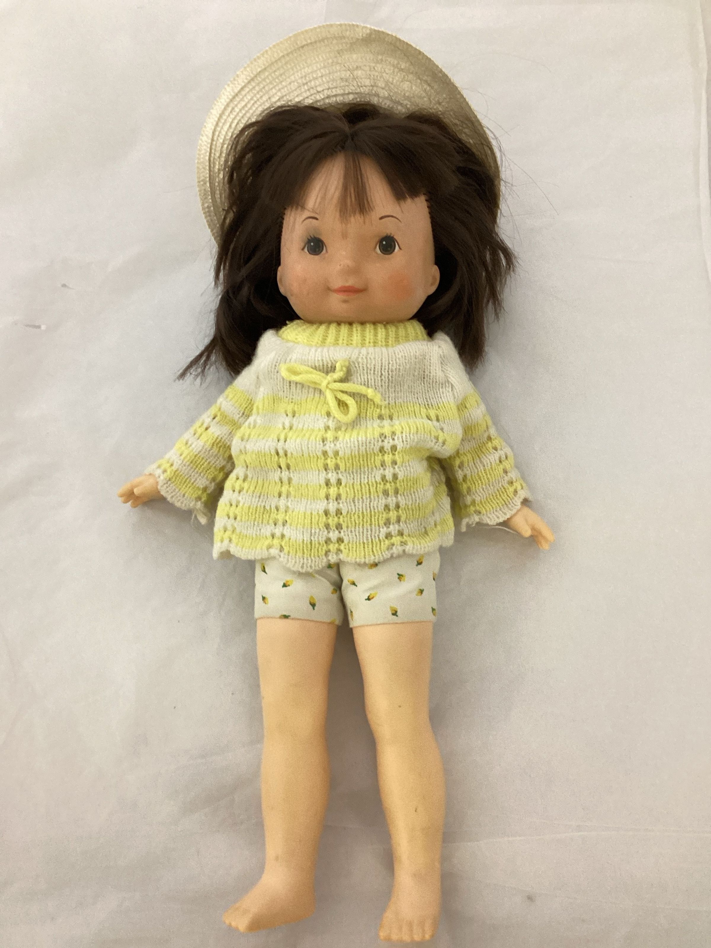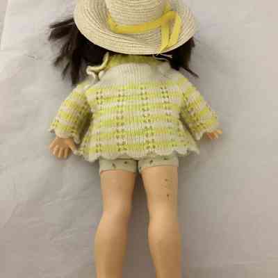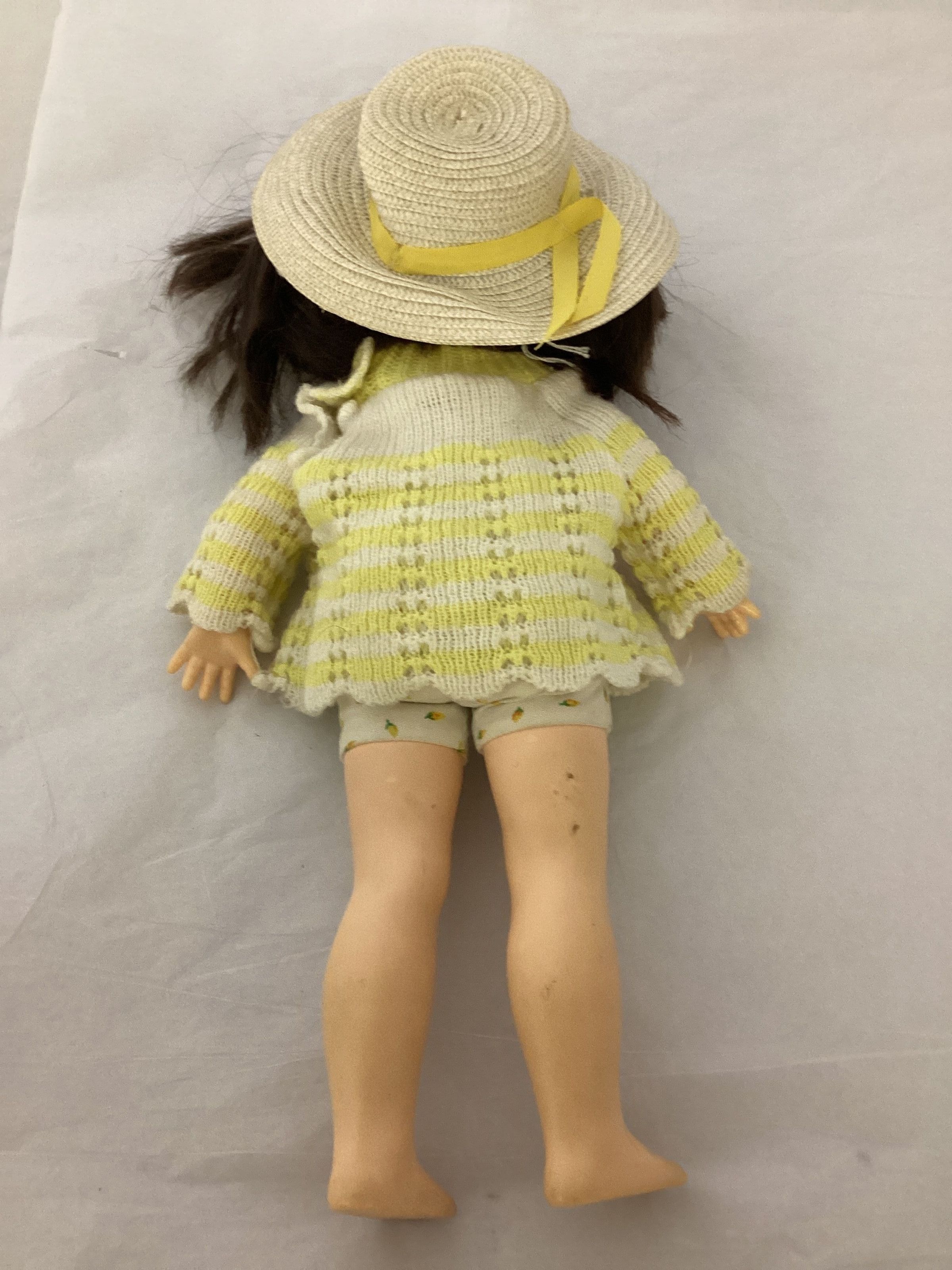 Posable doll with turning head. Dark brown hair straight shoulder length and bangs. Cloth body with plastic head, arms, legs. Acrylic knit sweater in yellow and white. Straw hat with yellow grosgrain ribbon bow. 1 piece clothing under sweater with short legs, white background with tiny yellow rosebuds.Collection