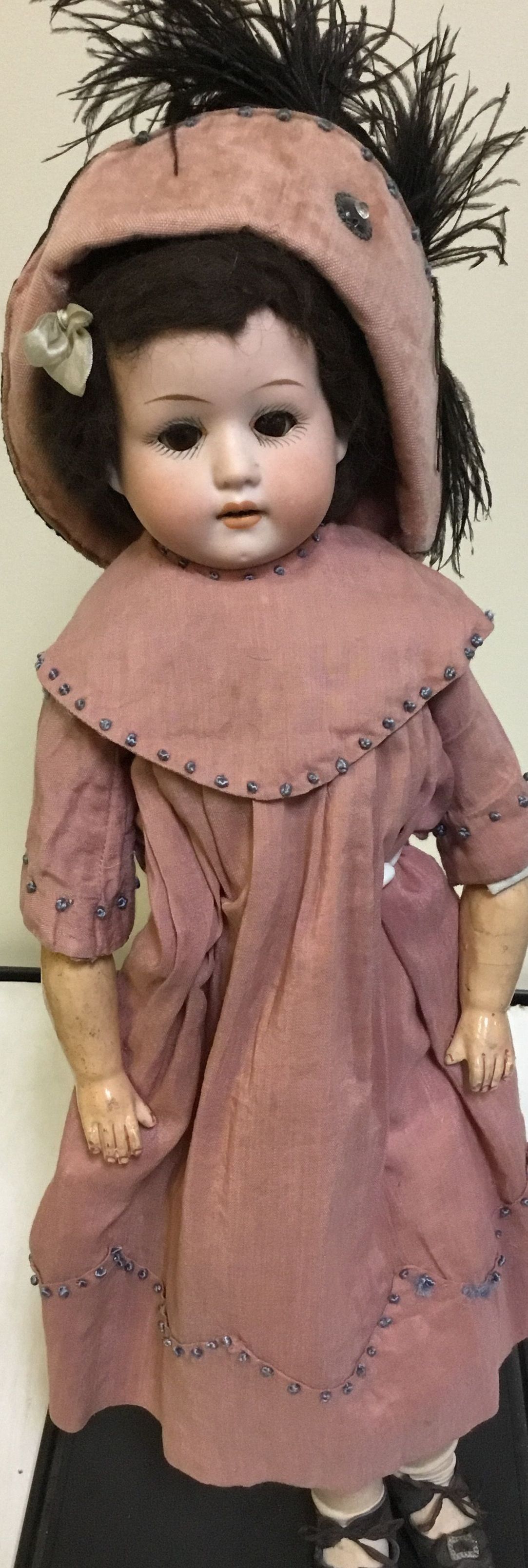 17” tall doll with bisque head and china arms and lower legs. Jointed at elbows, knees and hips. No markings noted. Eyebrows, lashes and lips are painted on. Hair is brown closely woven material attached to head and pinned up in back. The dress is linen, pale pink color with blue embroidered French knots around round collar, scallop design around deep hem and around sleeves. The hat is pink velvet with French knots at top of brim and the back is black velvet with a few feathery details. She has a white bow in her hair. Black tie shoes with tiny buckles. She is anchored on a stand.
