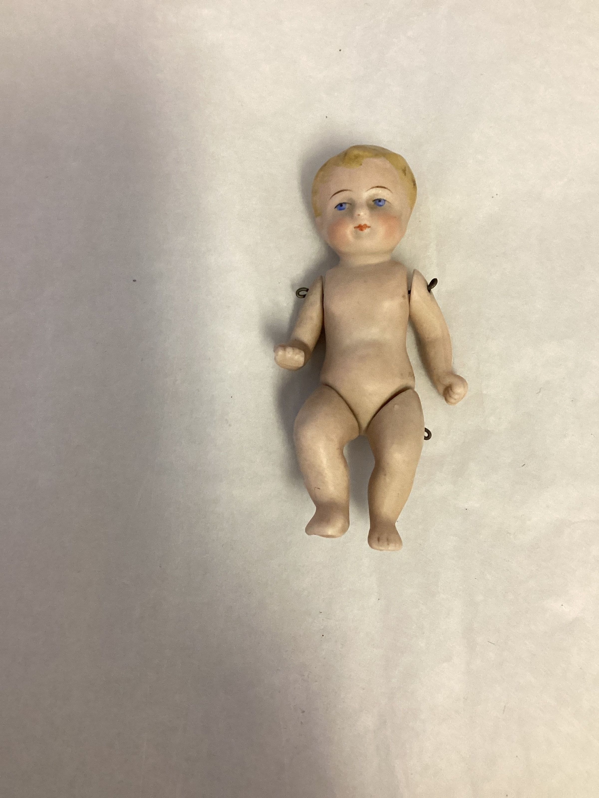 Baby doll; Blond hair showing brush strokes, painted features, blue eyes. Undressed, arms and legs attached with wire.Use