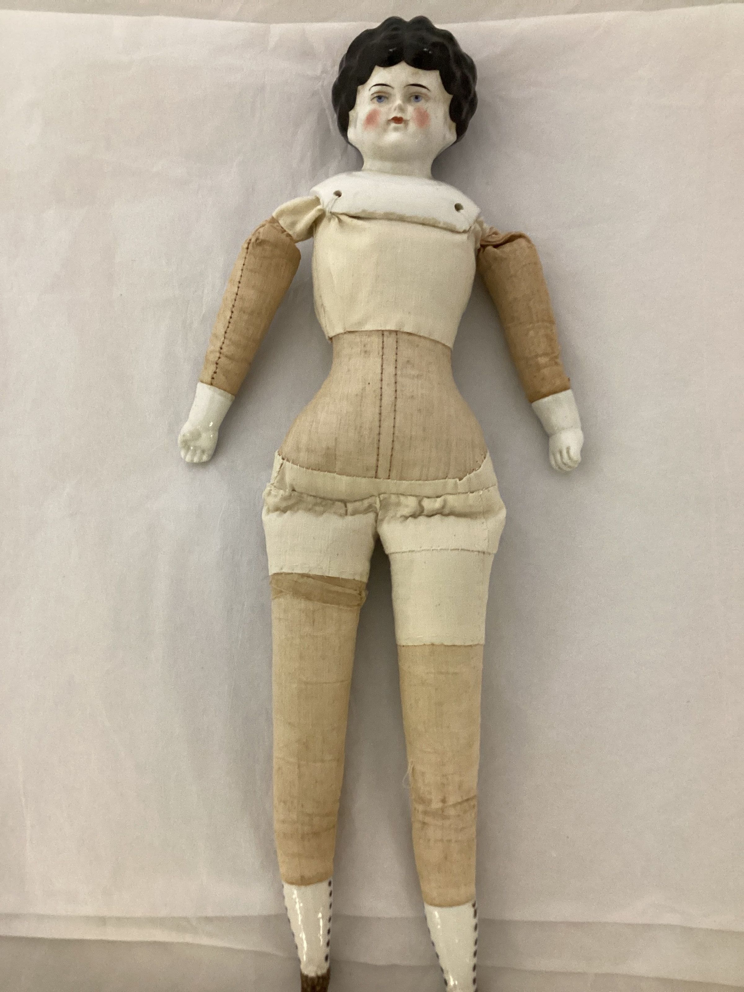 China head, neck, part of shoulders, hands and feet which are painted to look as if it is wearing shoes. Shoes are brown with white sides and brown buttons up the side, face has blue eyes, dark eye brows, dark hair, dark rose lips and cheeks. Body is muslin and filled with sawdust. Head is attached with string through 4 holes in shoulders, 2 in front and 2 in back.