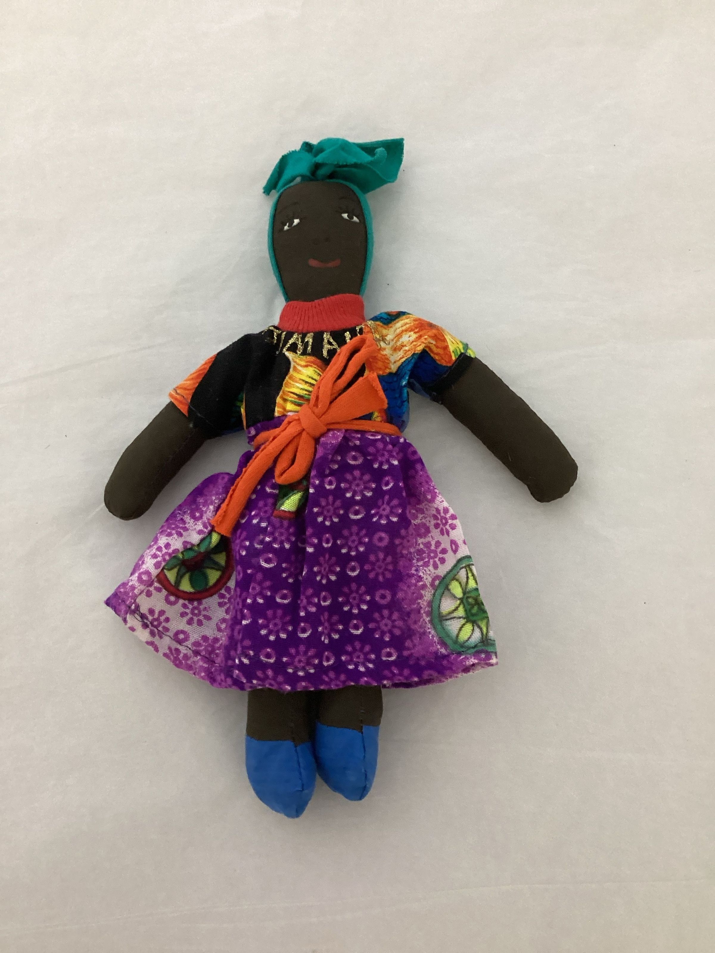 Doll made of black cotton with head covered In turquoise knit with knot on top. Red neckband. Multicolor dress with knit belt knotted at waist. Blue cotton shoes. Face is painted on. “JAMAICA” is stenciled in glitter gold on chest.Collection