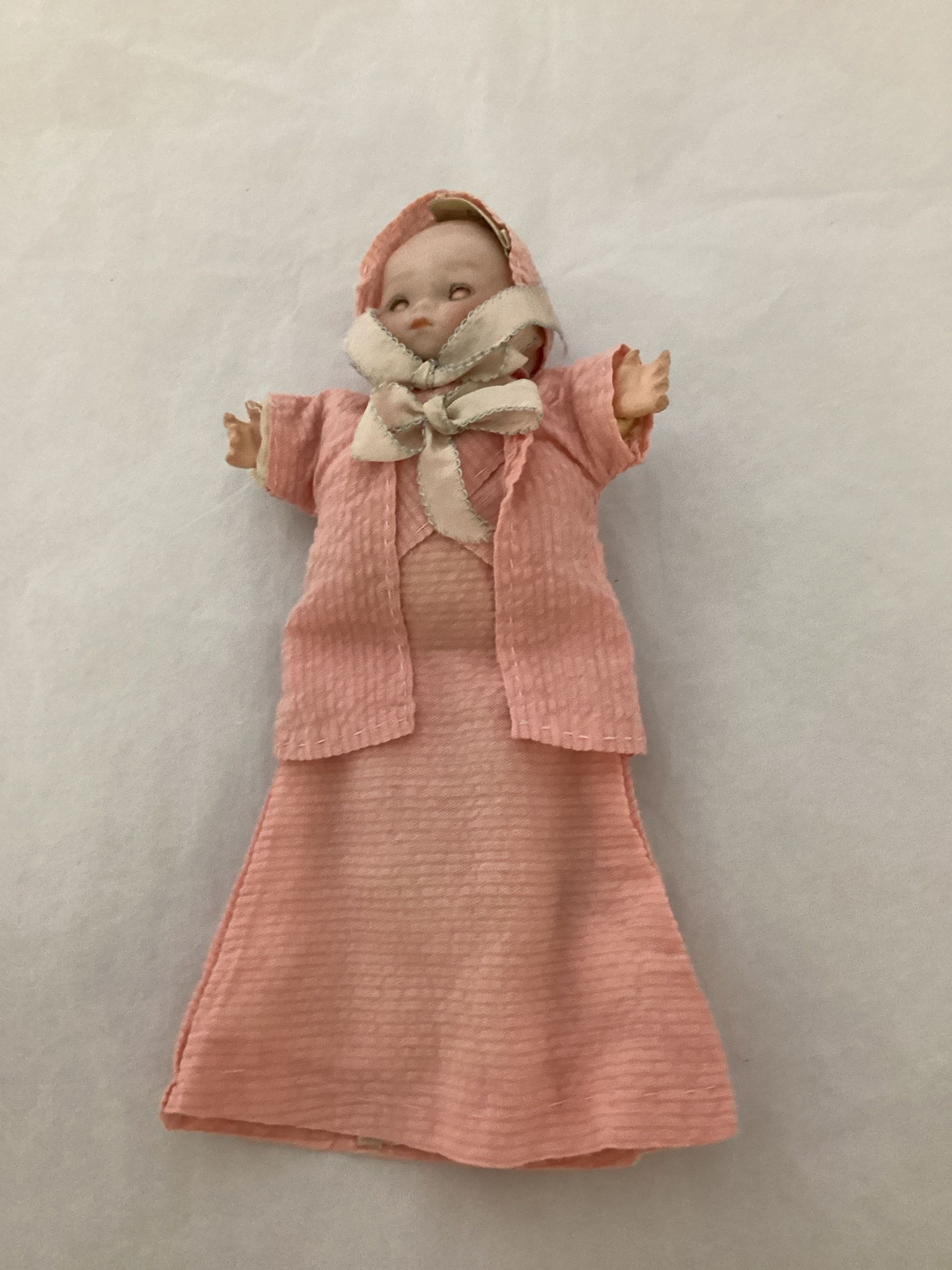 Bye-lo type doll; bisque head; brown sleep eyes; composition hands; muslin body; original clothing; slip; pink plisse dress; and sack and bonnet, with white ribbons edged in blue; pink plisse booties includes pillow, pad and blanket of outing flannel with butterfly botif, appears to be handmade.