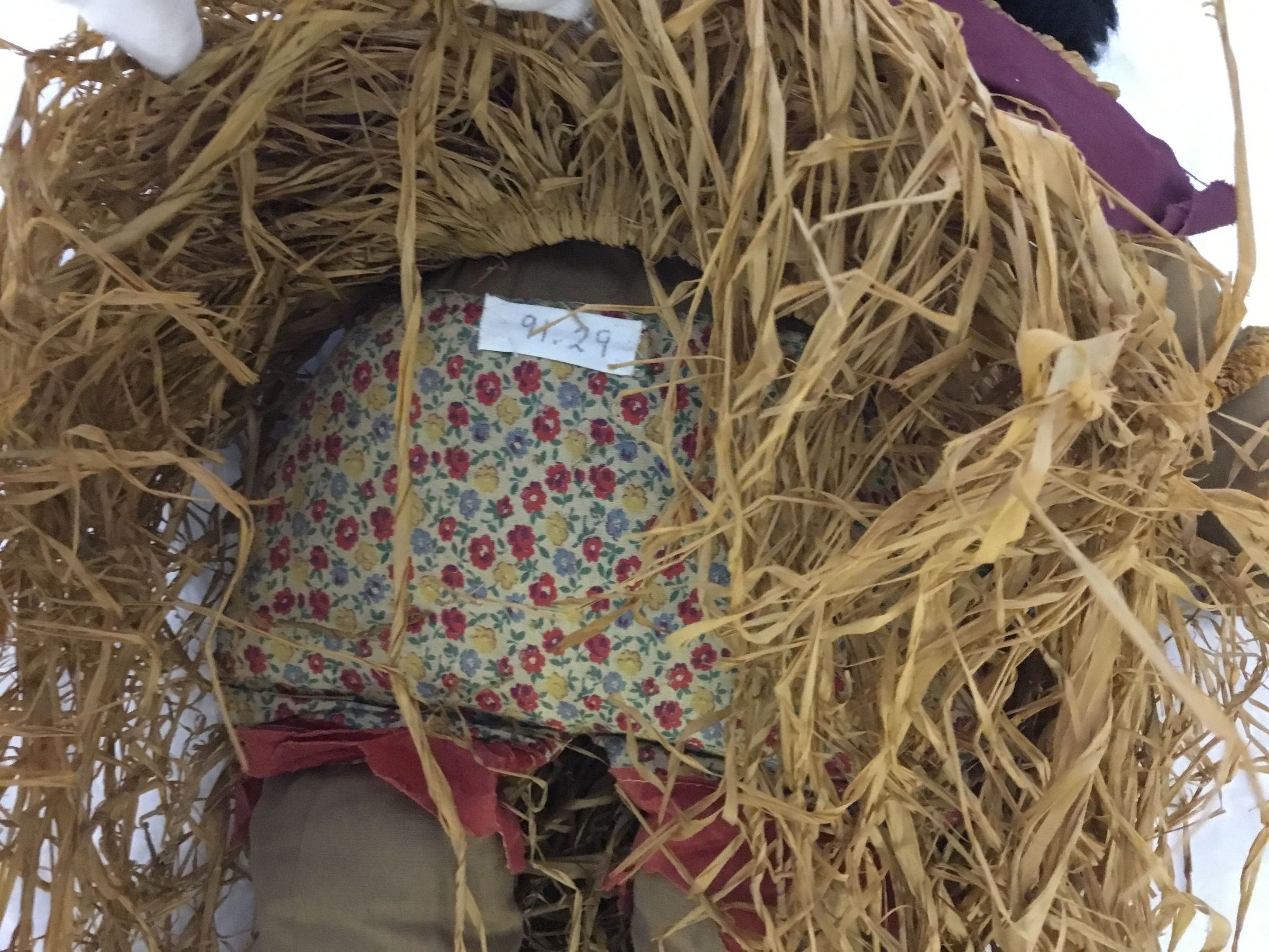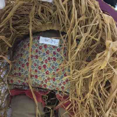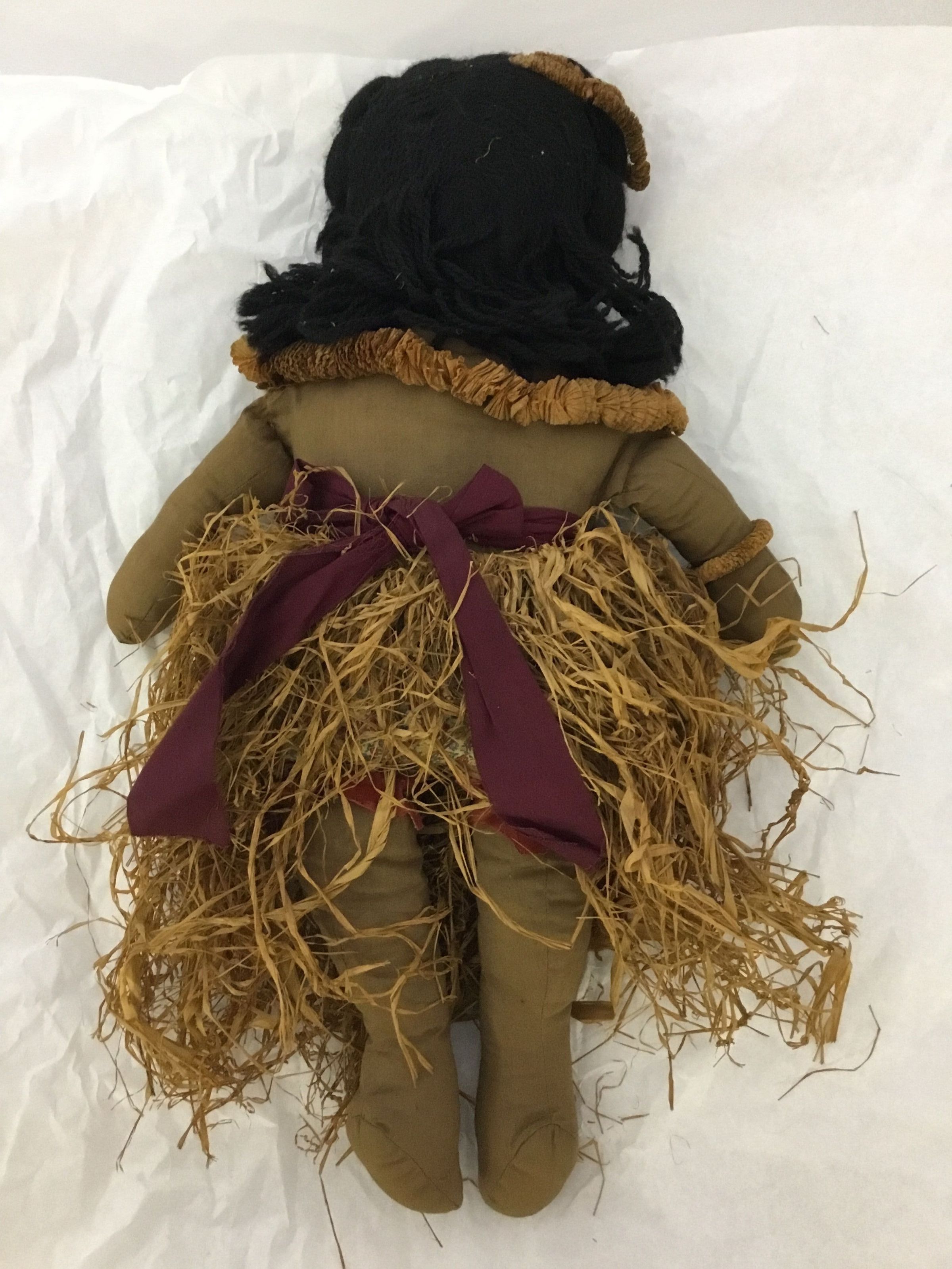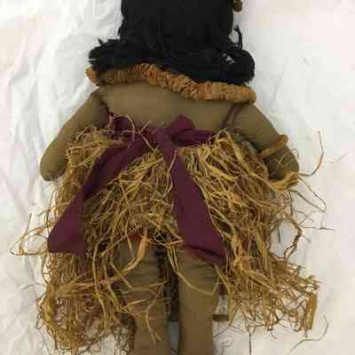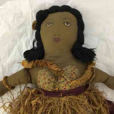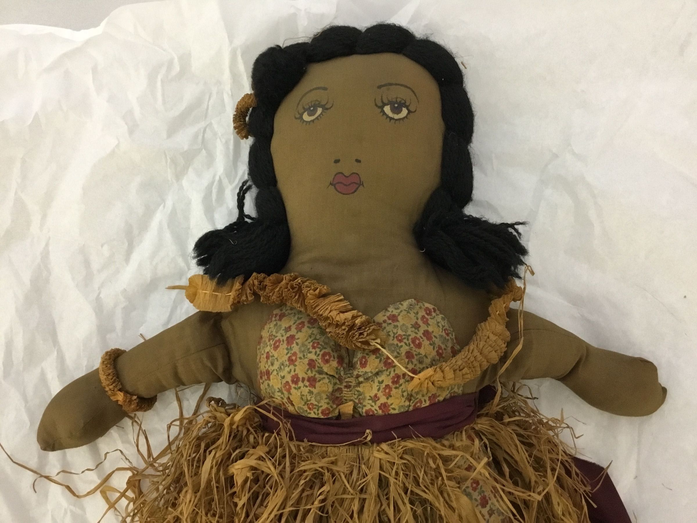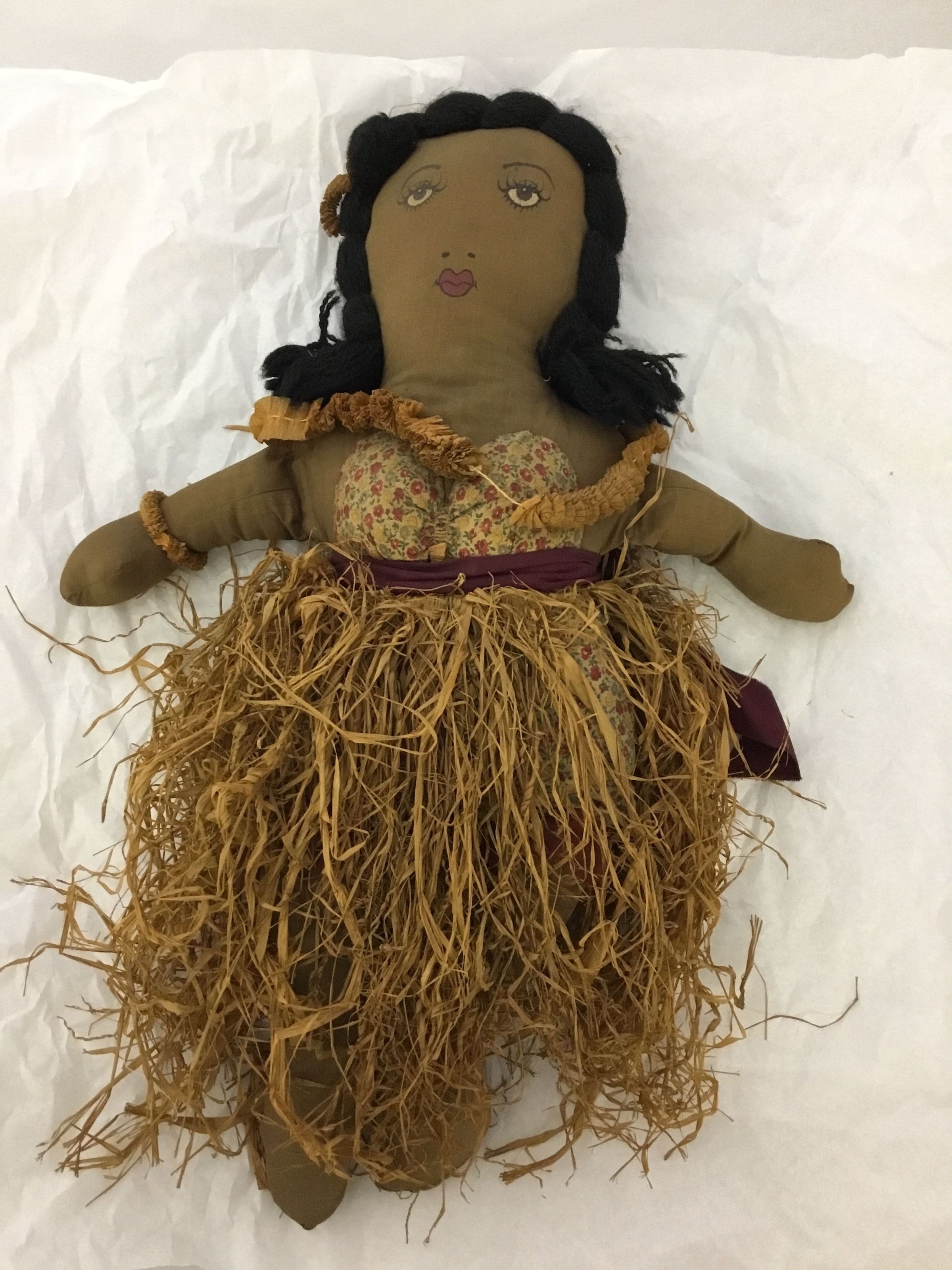 Hula doll; body brown cottonwith painted face; black yarn hair; panties and bra of printed material with purple sash and a grass skirt of straw; a straw lei around neck and straw garland in hair and around arm.
