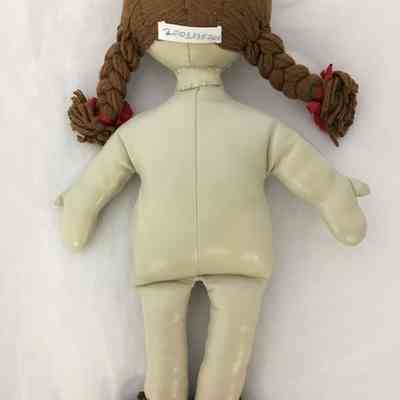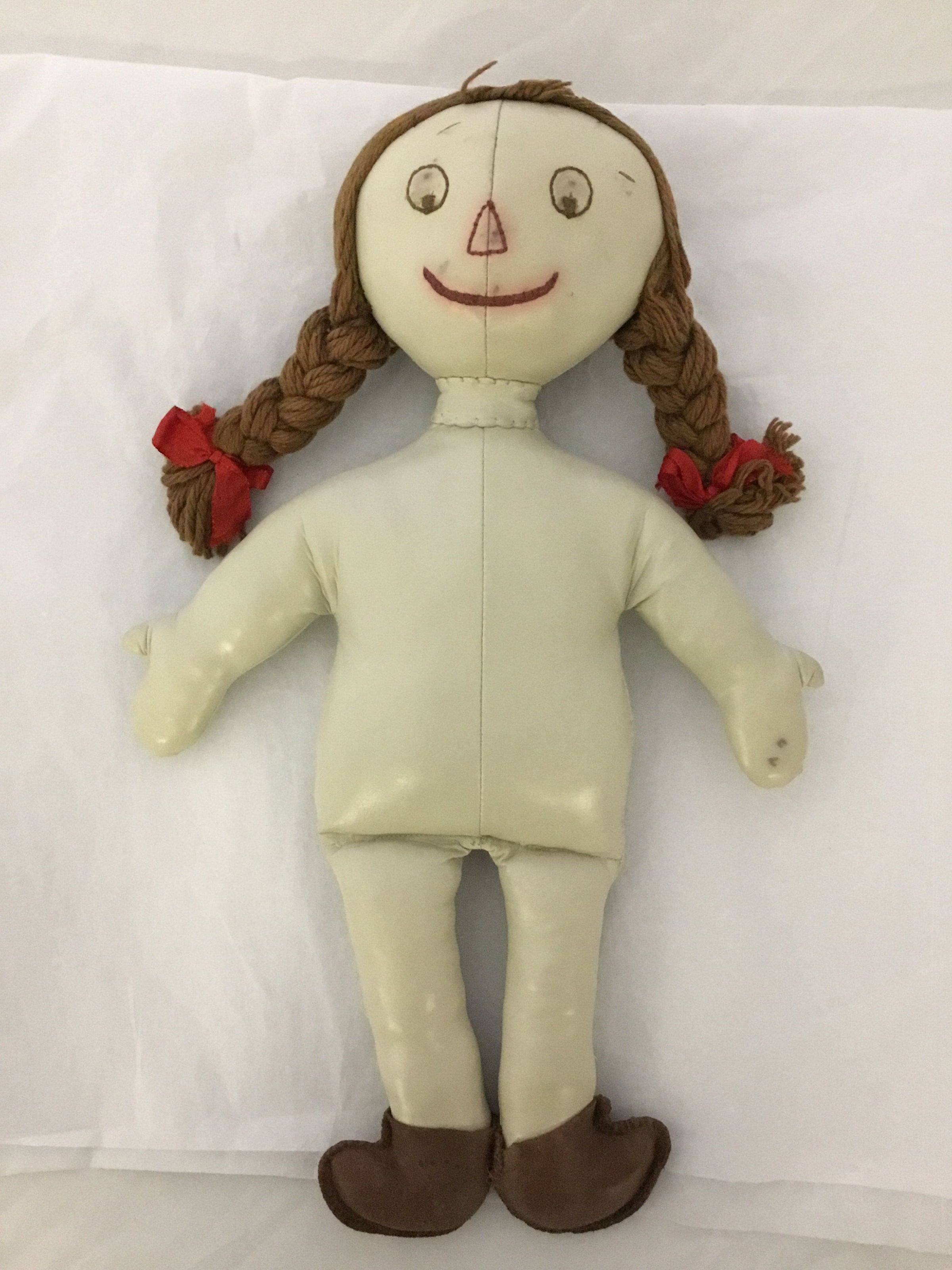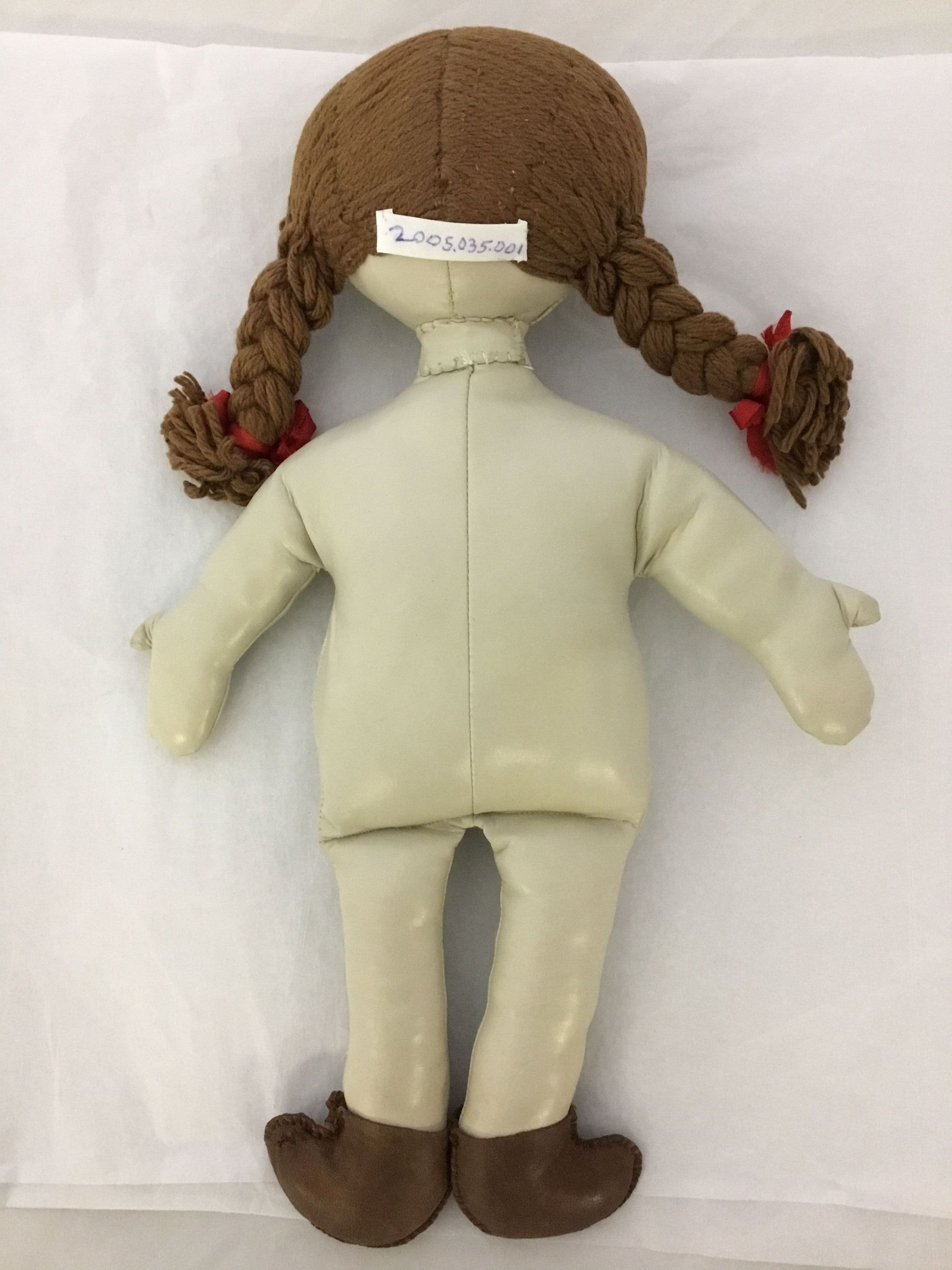 Pleather or vinyl hand sewn doll. Brown yarn hair in braids with red ribbon. Nose and mouth are red thread and eyes are brown thread sew on face. Two cuts in face, maybe eyebrows. Naked with brown handsewn real leather shoes. Tag on back with object number 2005.035.001.Collection