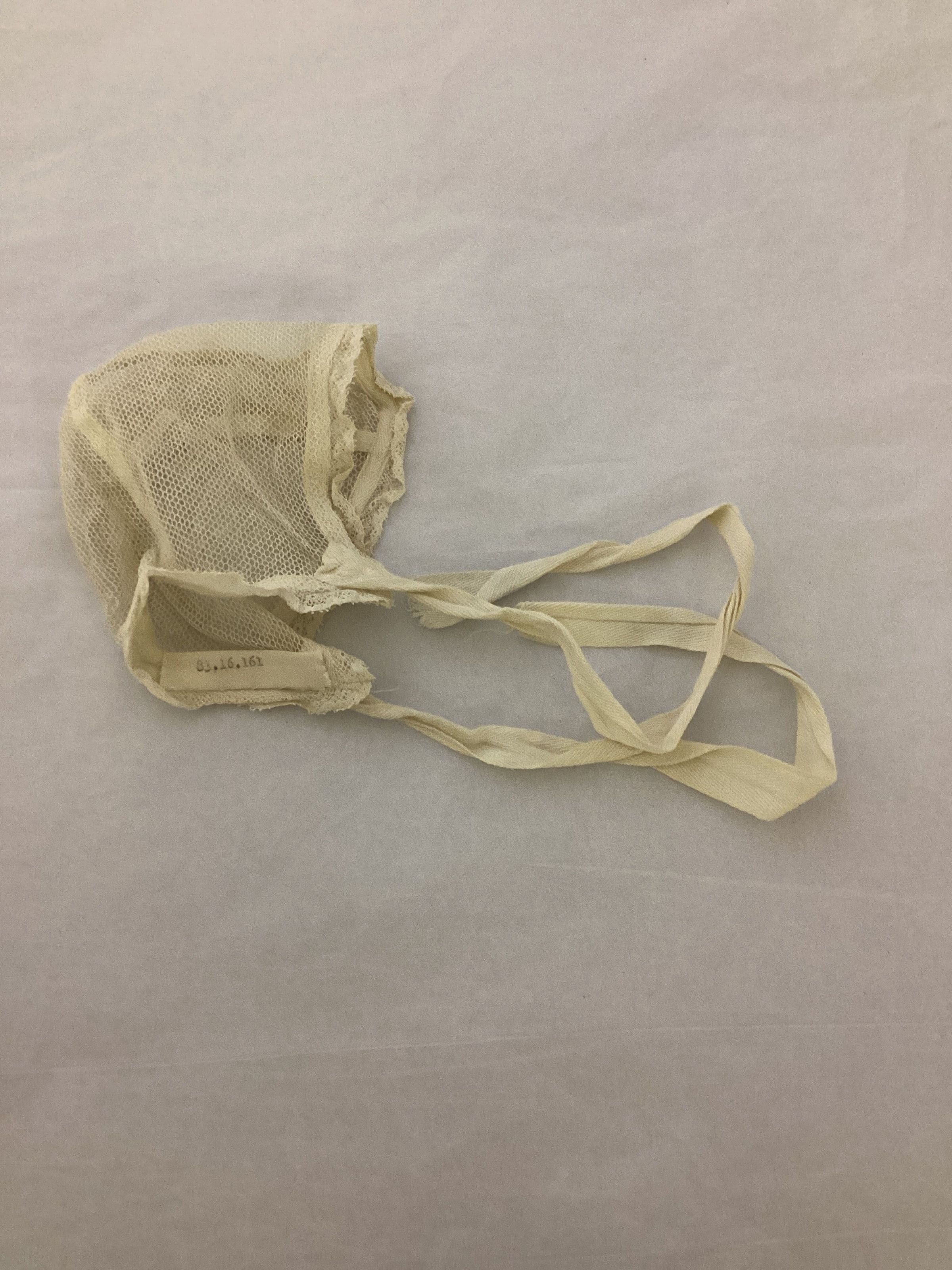 Doll bonnet made of net with 1 middle piece and 2 side pieces; lace edging along front edge; twill tape strings.Collection