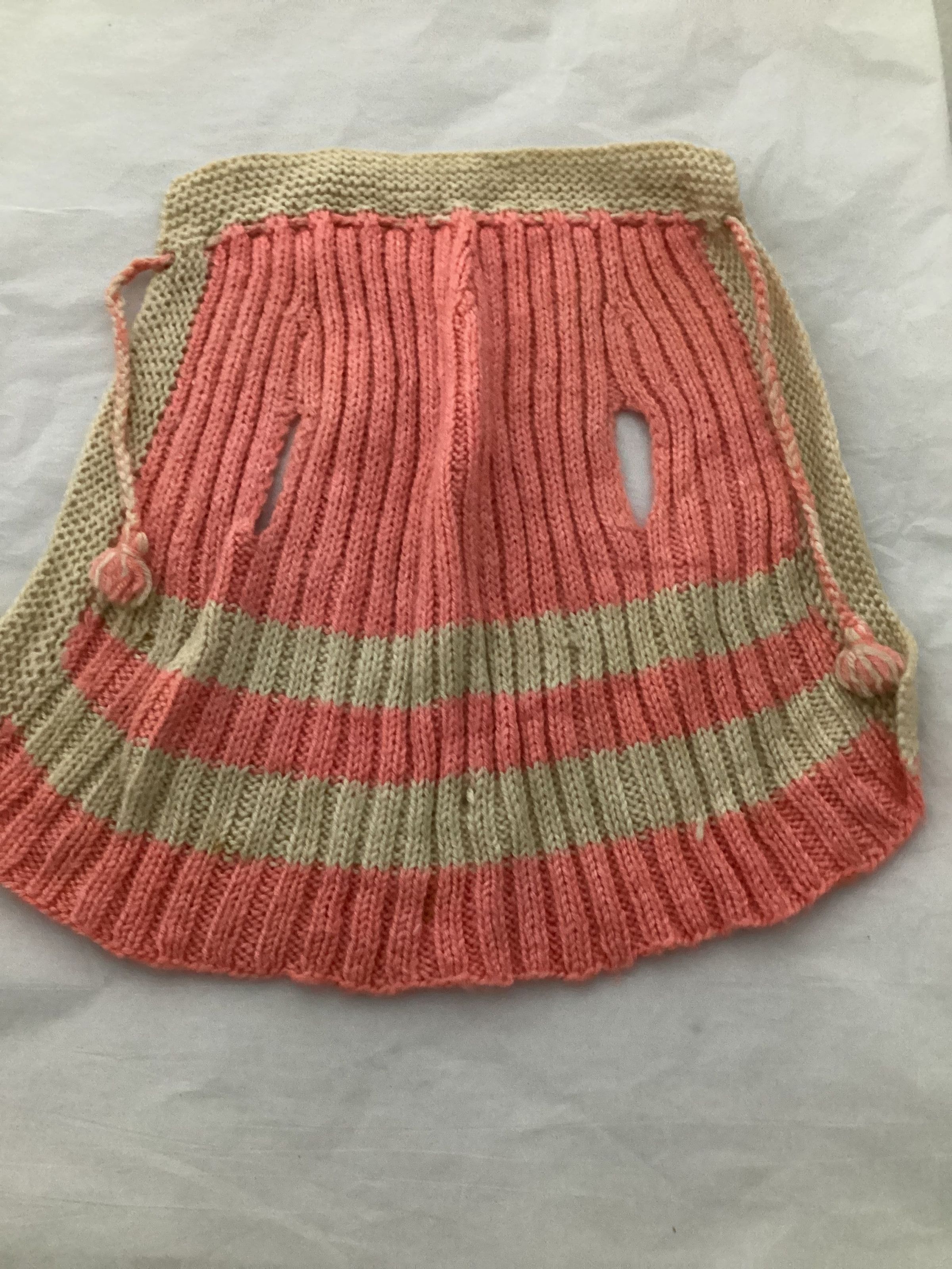 Pink knitted cape with knitted white stripes; stand-up collar and front edges in white knitted wool; knitted cord woven through top for the tie.Collection