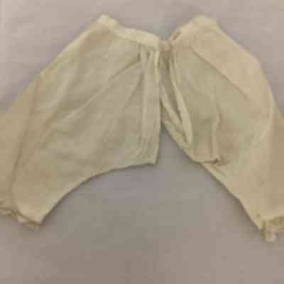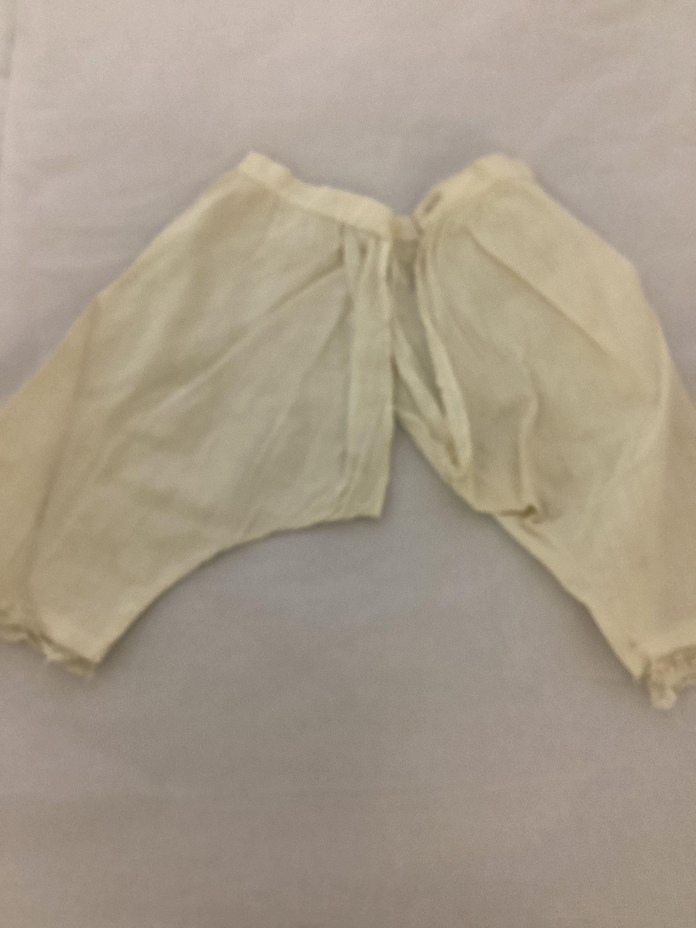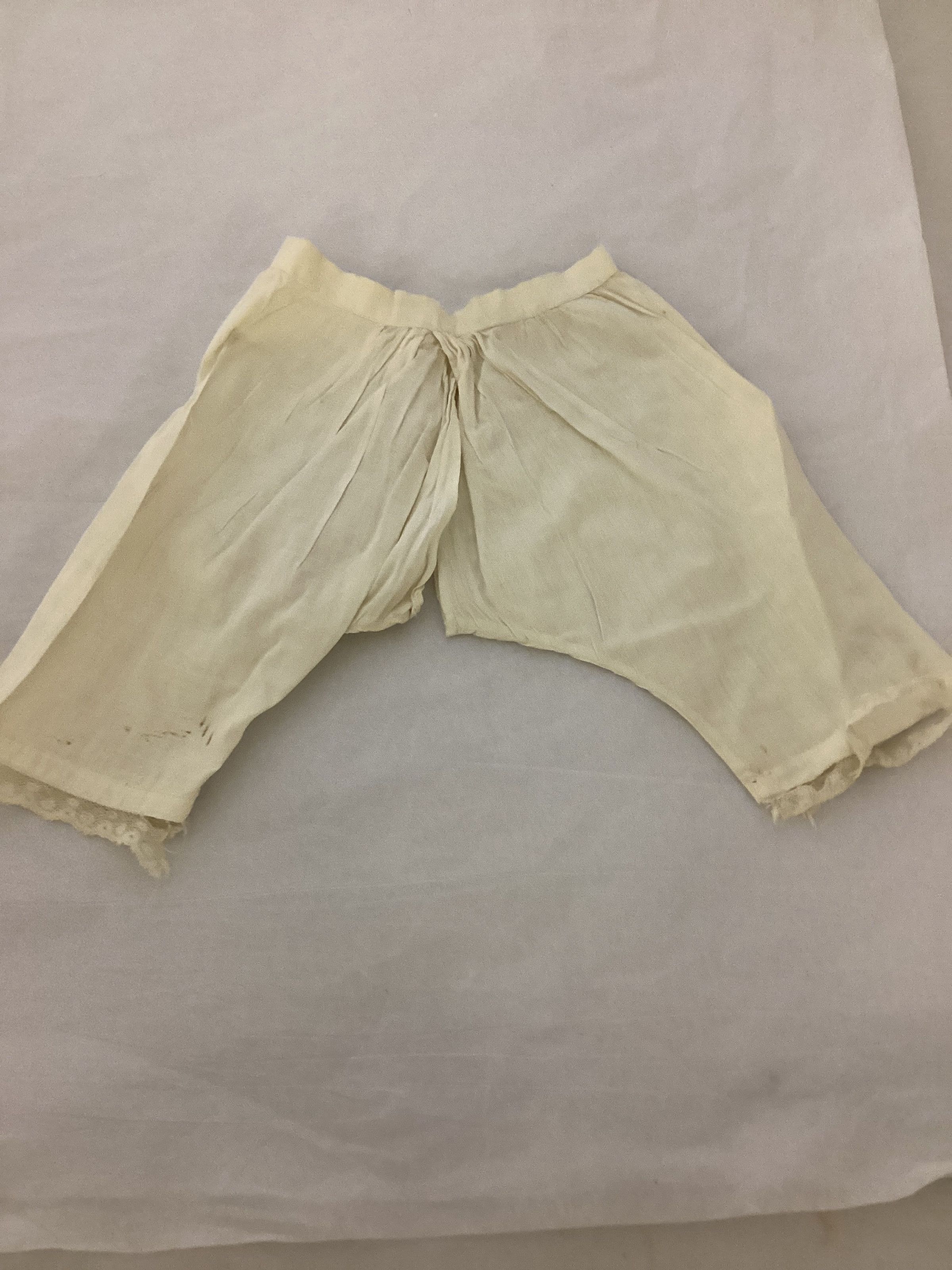White cotton divided drawers; 10" legs edged with lace & gathered into a 5/8" waistband; buttoned in back with small white button.Collection