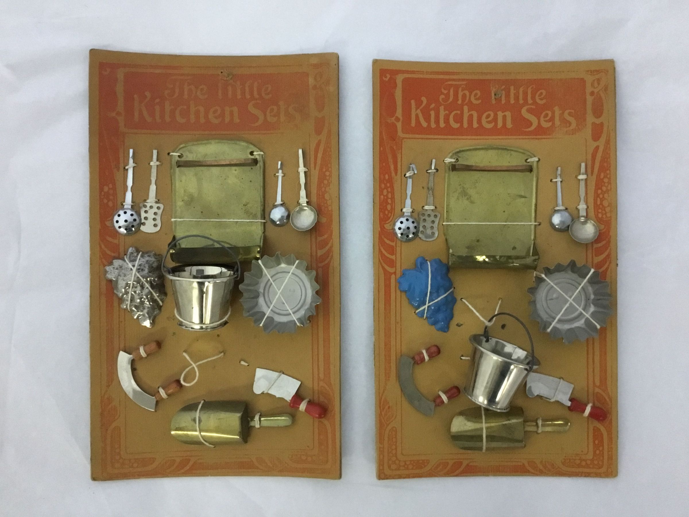Two 11 piece sets of toy cooking utensils; attached to a cardboard 10-3/8 x 6. Top row has 4 cooking spoons-2 pierced and 2 solid; on each side of comb and towel holder. Next row has grape mold bucket, fluted mold. 3rd row 2 handled vegetable cutter and cleaver. Row 4 scoop; they are all attached to cardboard with strong twine. Cardboard is tan with a red border; at top printed "The Little Kitchen Sets".
