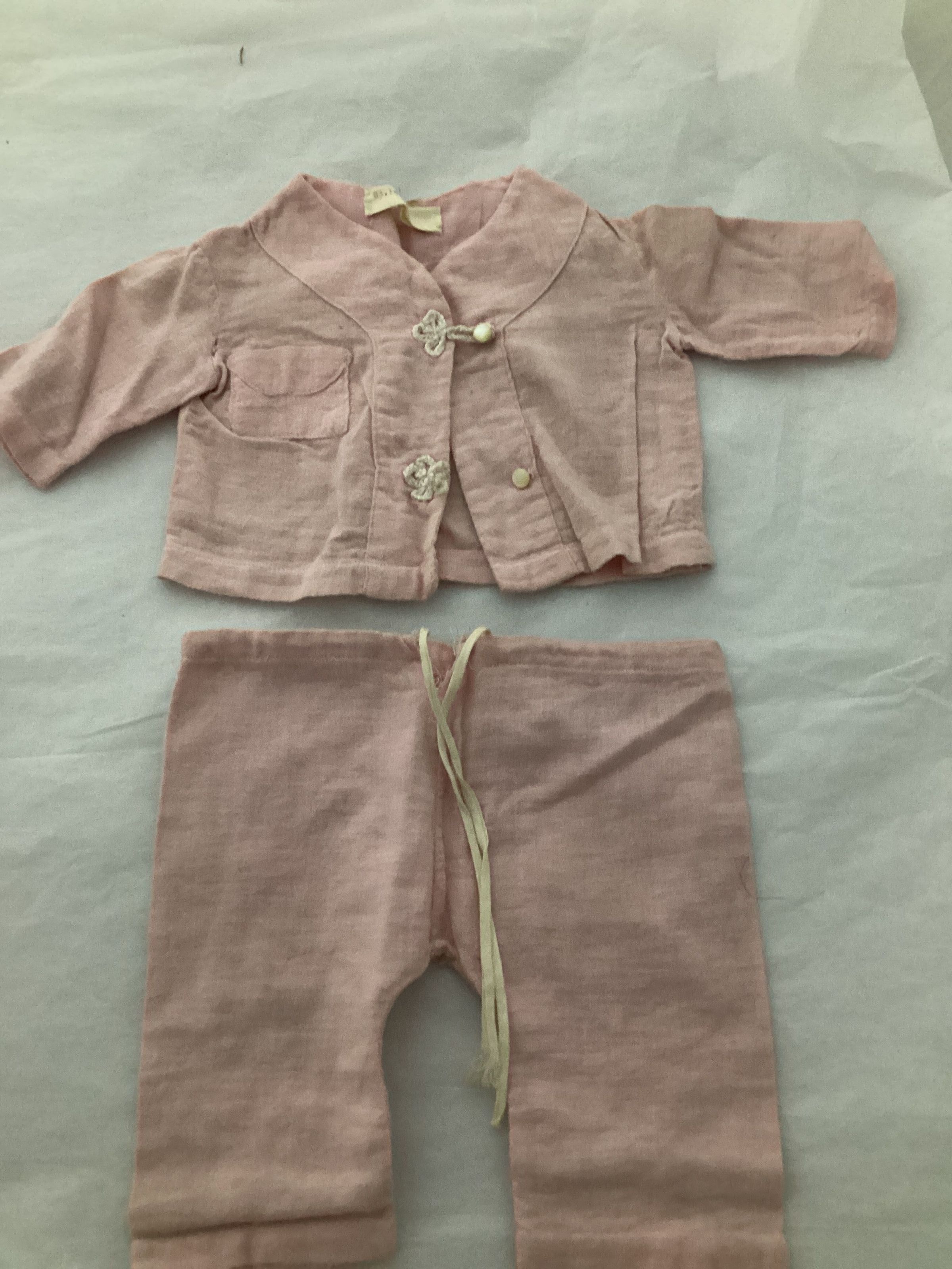 A: Pink cotton flannel pajama top; neck & front edged in 1.25" bias tape; closed with 2 silk frogs with tiny white pearl buttons; 7" long; one pocket on right front.